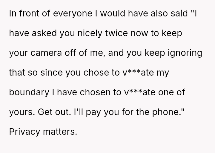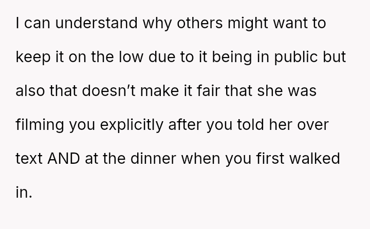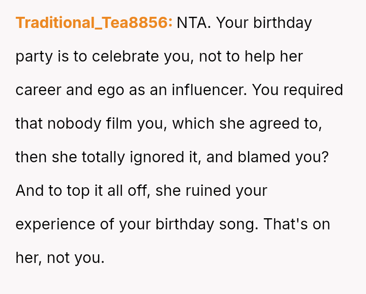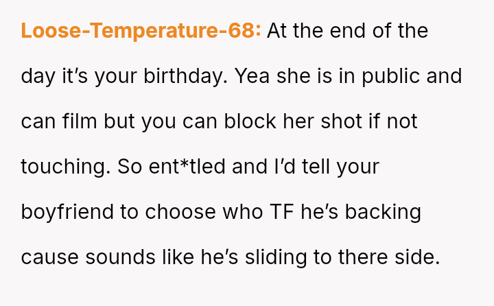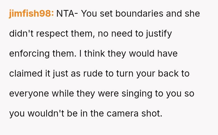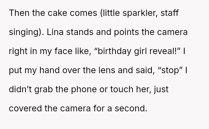 Was the OP justified in physically blocking the camera lens to enforce a clearly communicated boundary on their own birthday, or did the public nature of the setting and the timing during a special moment make their reaction an overreaction that escalated an already delicate situation?