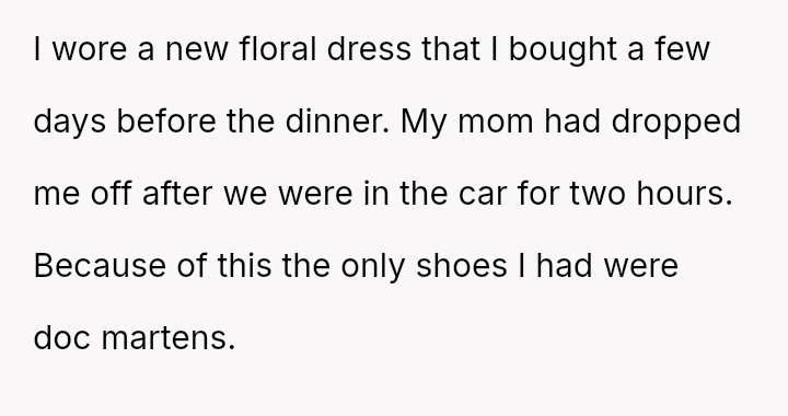 Her floral dress and worn Doc Martens become symbols of her quiet rebellion and the complex dance of trying to be herself while seeking approval in a family bound by unspoken rules.