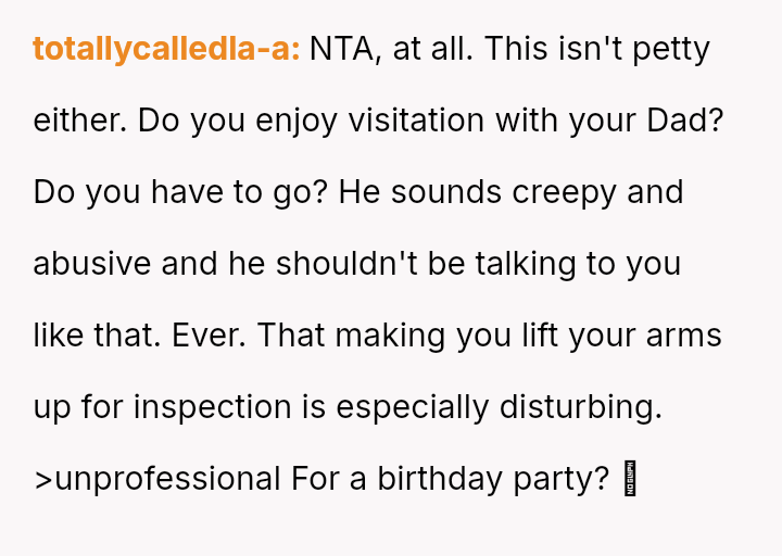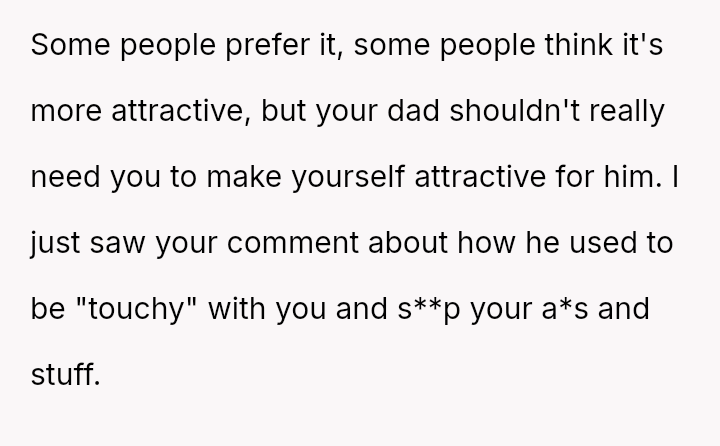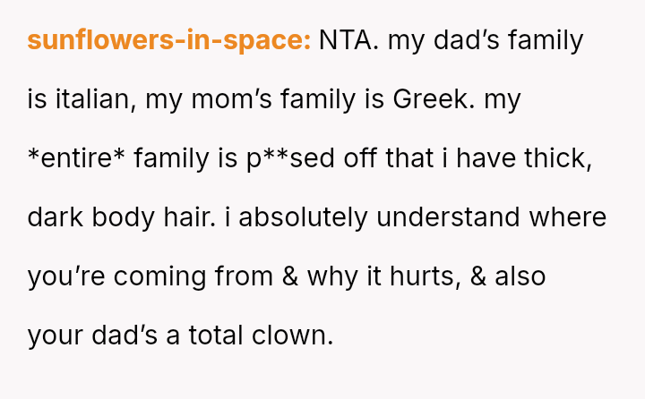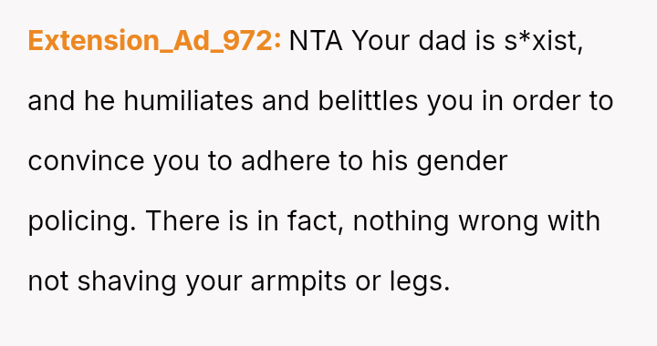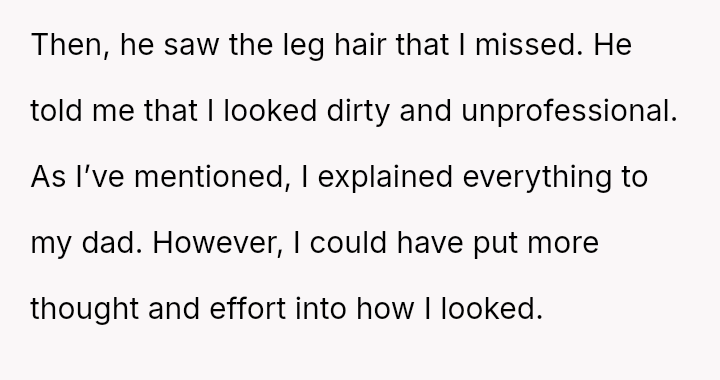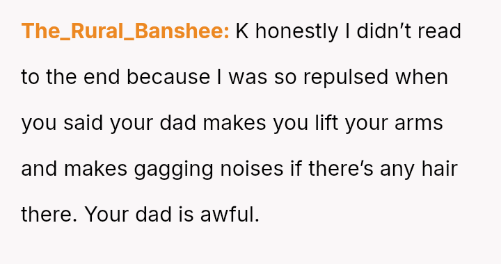 The original poster (OP) is clearly struggling with the conflict between their desire for personal autonomy regarding their appearance and their father's strict, critical expectations, especially concerning body hair and dress code for a family event.