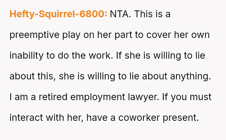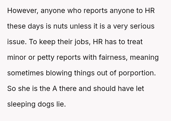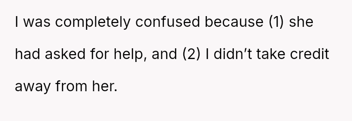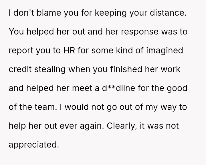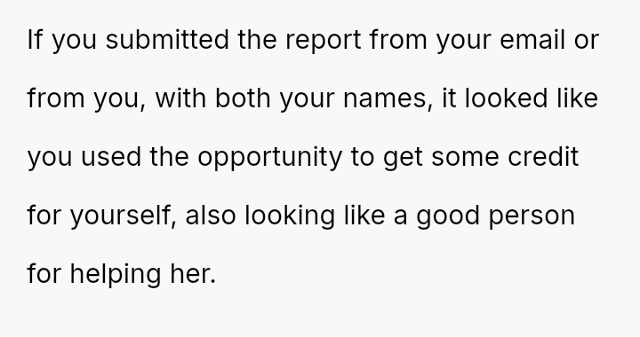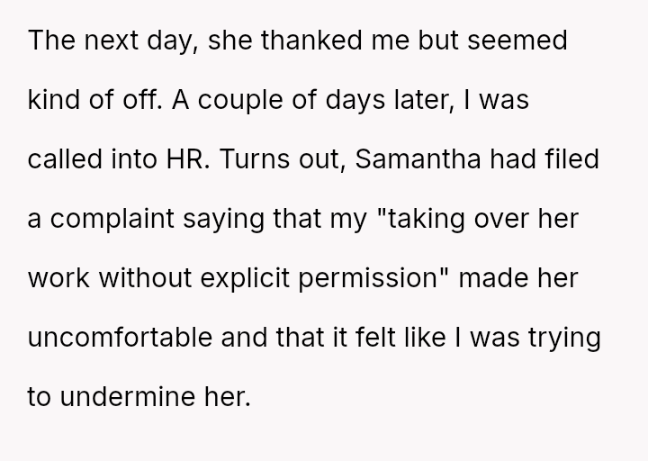 The situation immediately turned negative when Samantha later filed a complaint with HR, stating that the OP taking over her work without explicit permission made her uncomfortable and felt undermining.