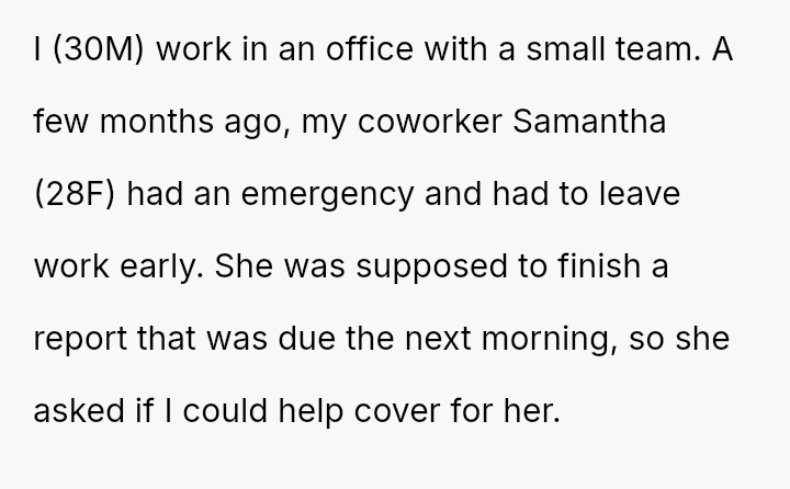 The user, a 30-year-old man (OP), was working with his small office team when his coworker, Samantha (28F), had an emergency and asked him to complete a work report due the next day.