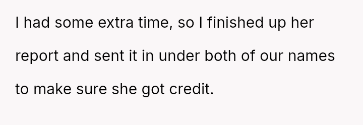 The OP agreed to help, finished the report, and submitted it under both of their names to ensure Samantha received credit.