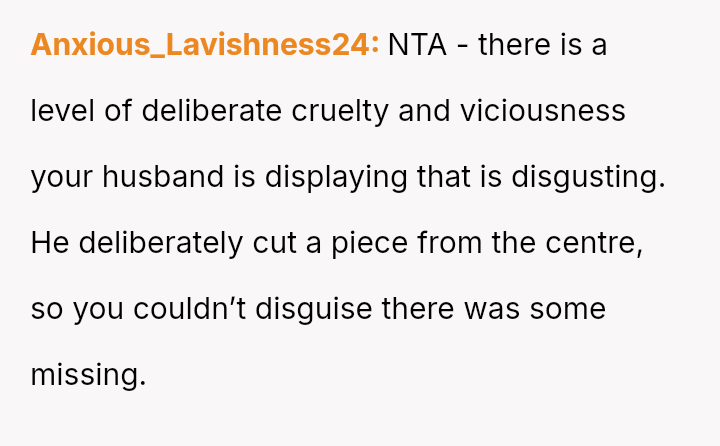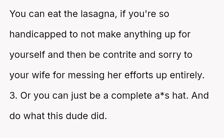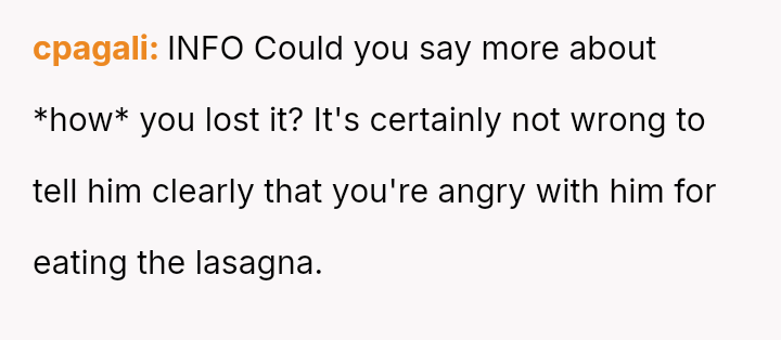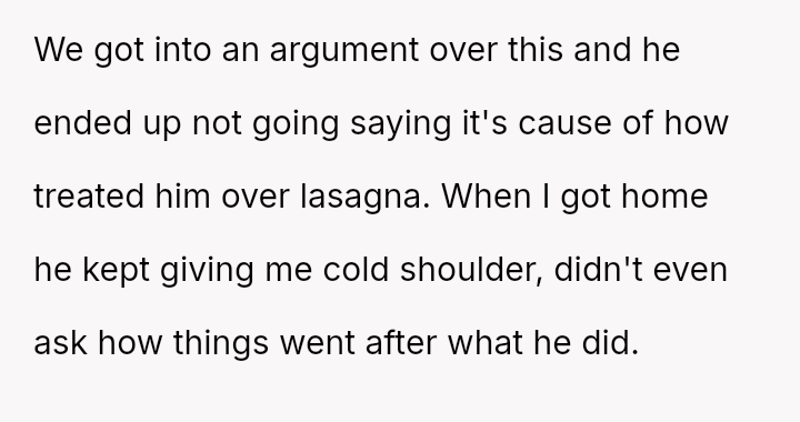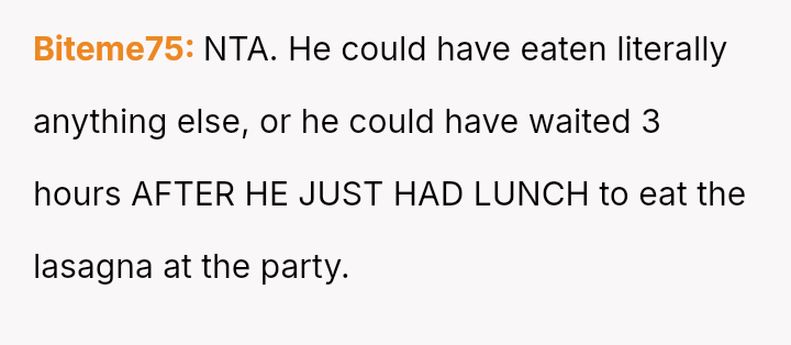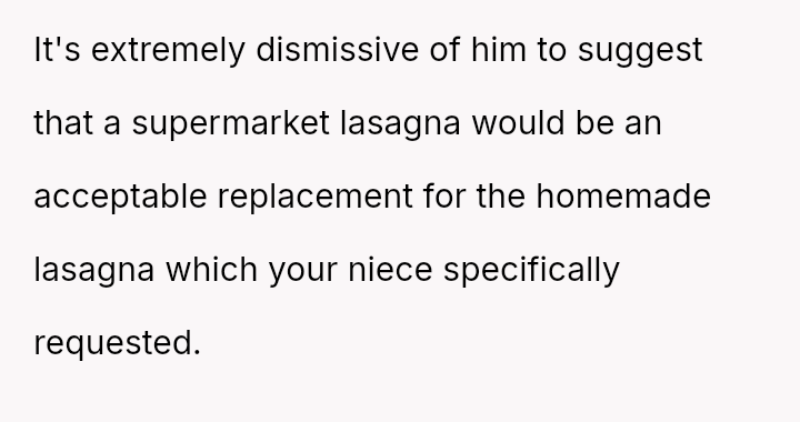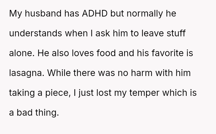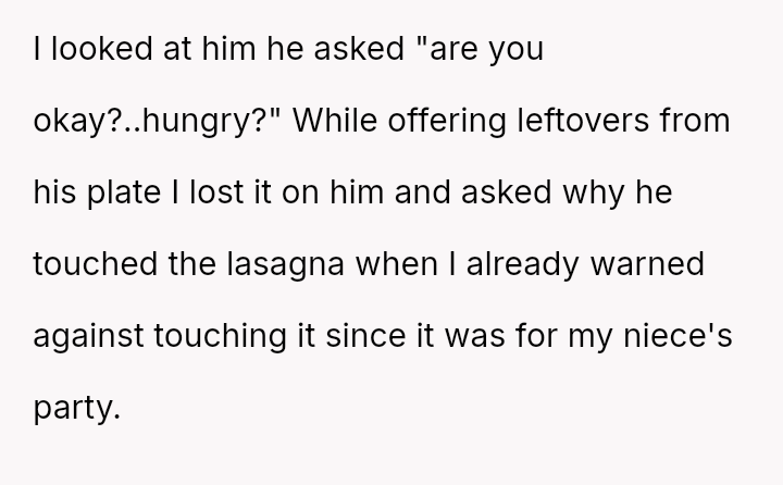 Given that the husband's action, while minor in scope (one piece of lasagna), directly v***ated a stated boundary for a child's special event, should the OP's strong emotional reaction be viewed as an overreaction to a food item, or was it a justified response to a fundamental breach of respect and consideration within the marriage?