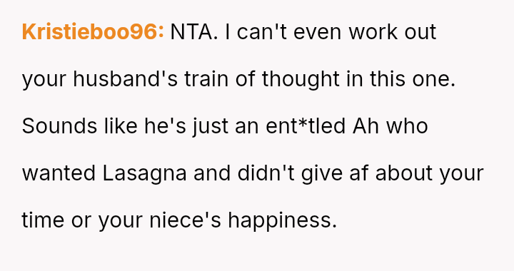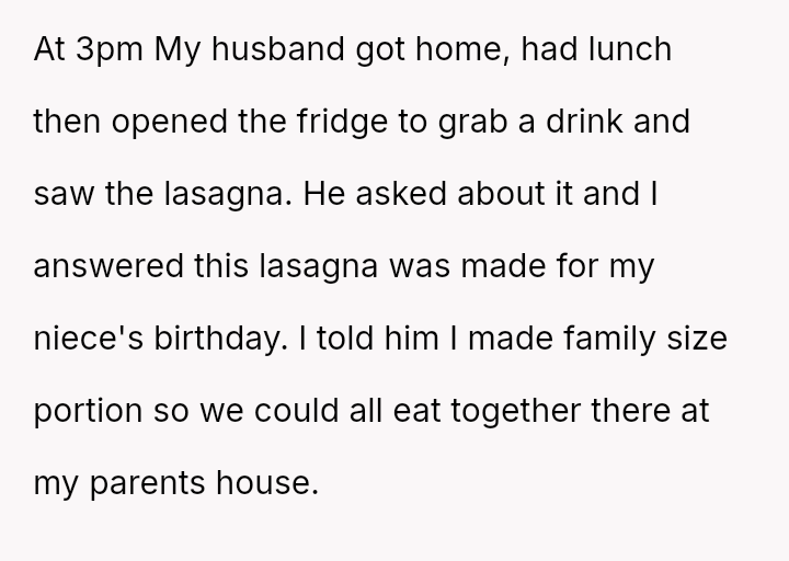 The Original Poster (OP) invested significant time and care into preparing a special lasagna specifically for her niece's birthday celebration, leading to a clear boundary set with her husband regarding this special item.