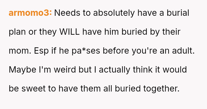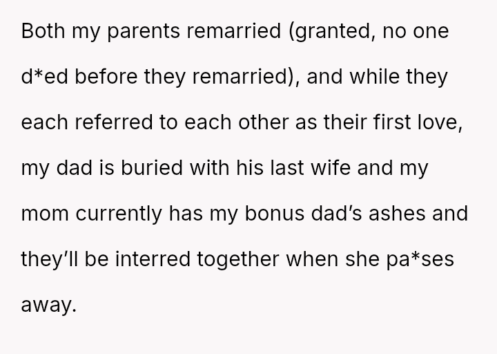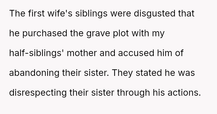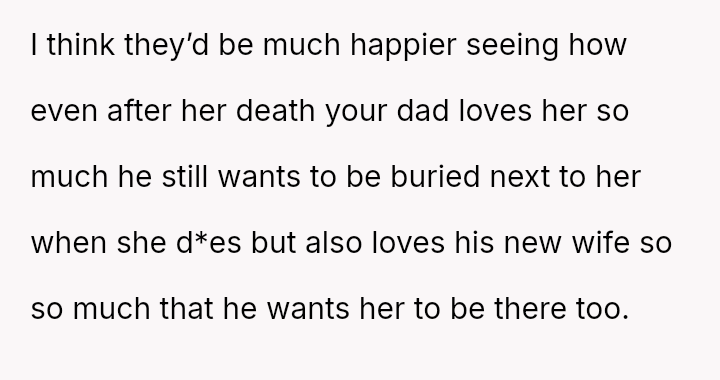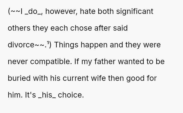 The original poster (OP) is caught in a severe emotional conflict stemming from their father's second marriage and subsequent decisions regarding his final resting place.