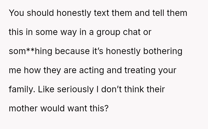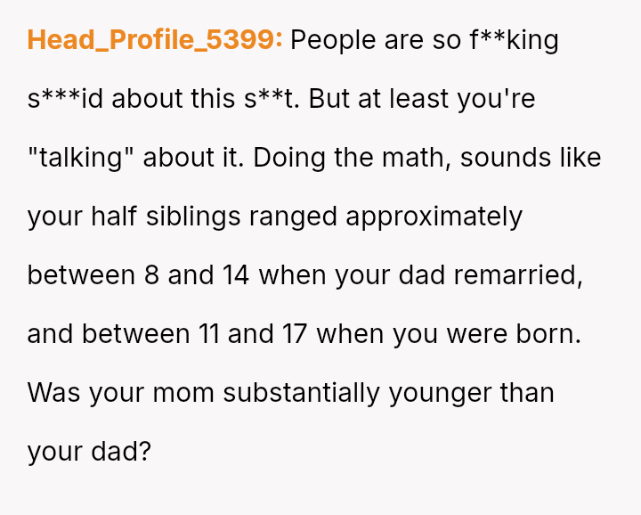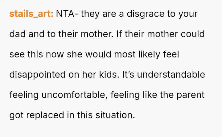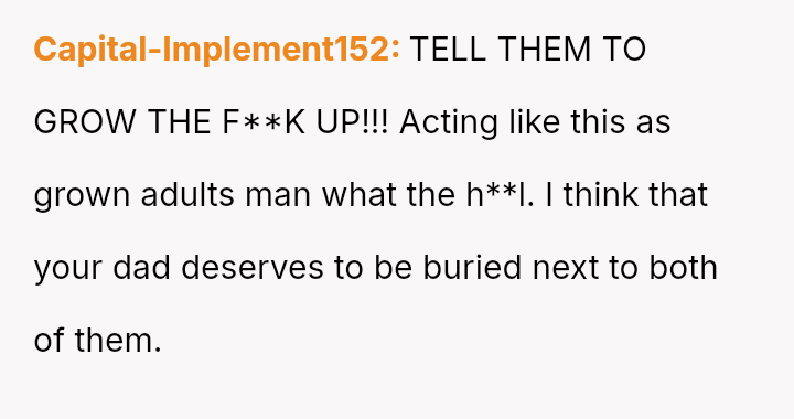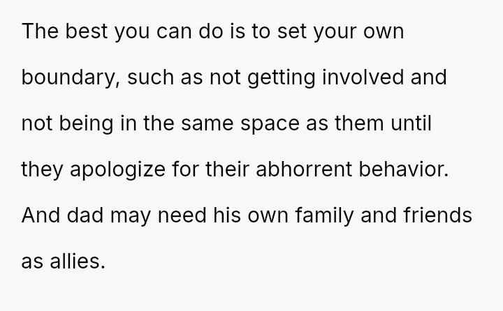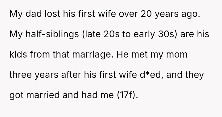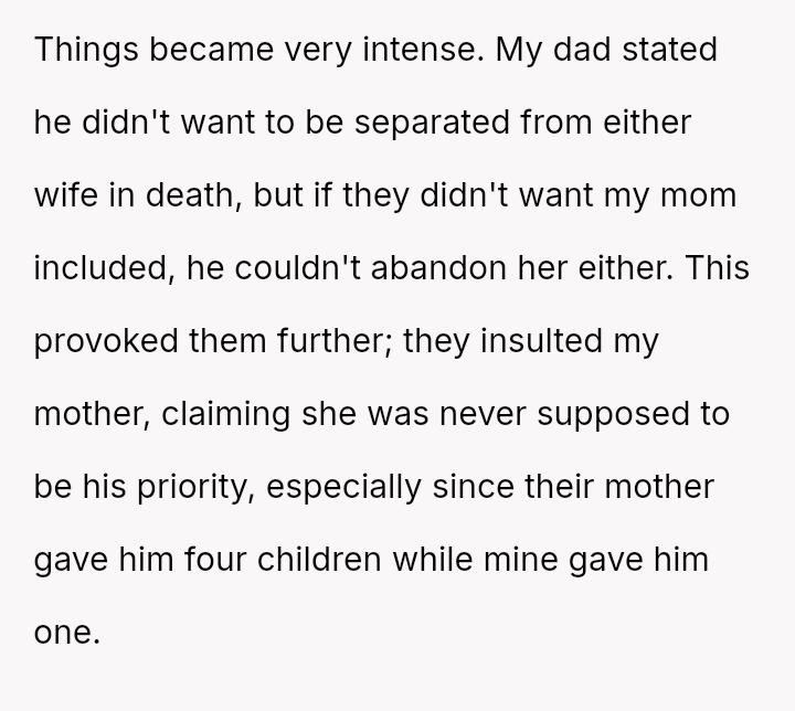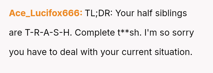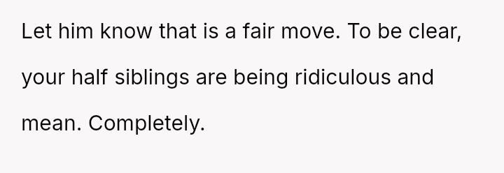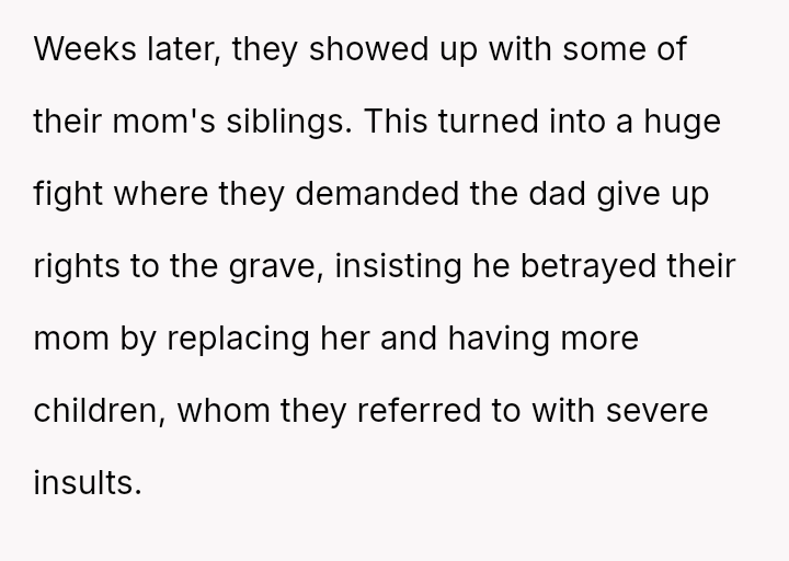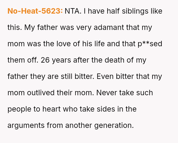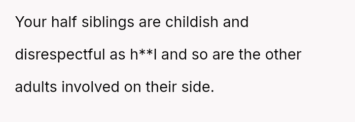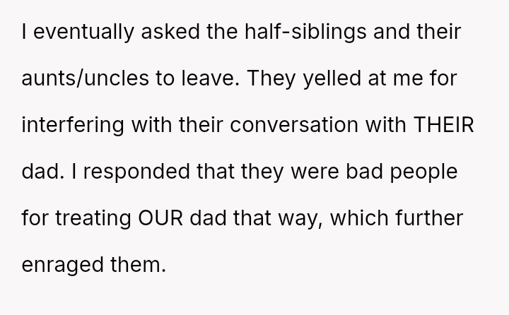 The OP defended their mother and father against aggressive accusations and demands from the half-siblings and their family.
