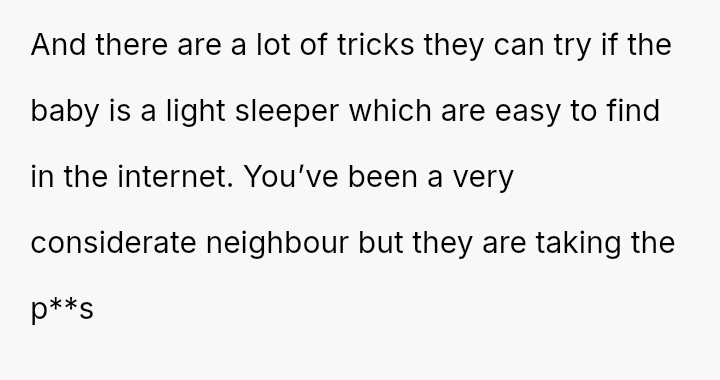 Is the OP justified in ceasing all voluntary noise restrictions, or is there a middle ground that respects both property rights and the neighbor's urgent need for sleep?