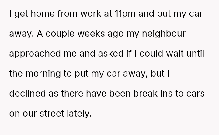 When asked to delay parking his car late at night due to noise, he faces an impossible choice—between protecting his prized vehicle from thieves and respecting the neighbor’s plea—unfolding a silent struggle where empathy, fear, and frustration collide in the stillness of the night.