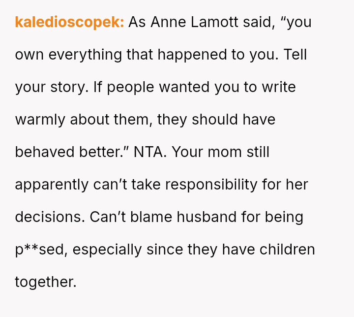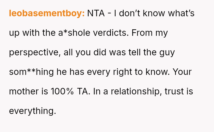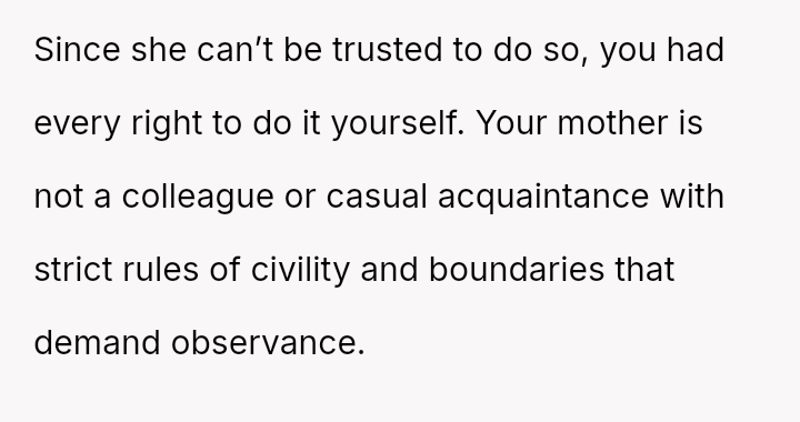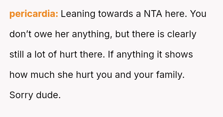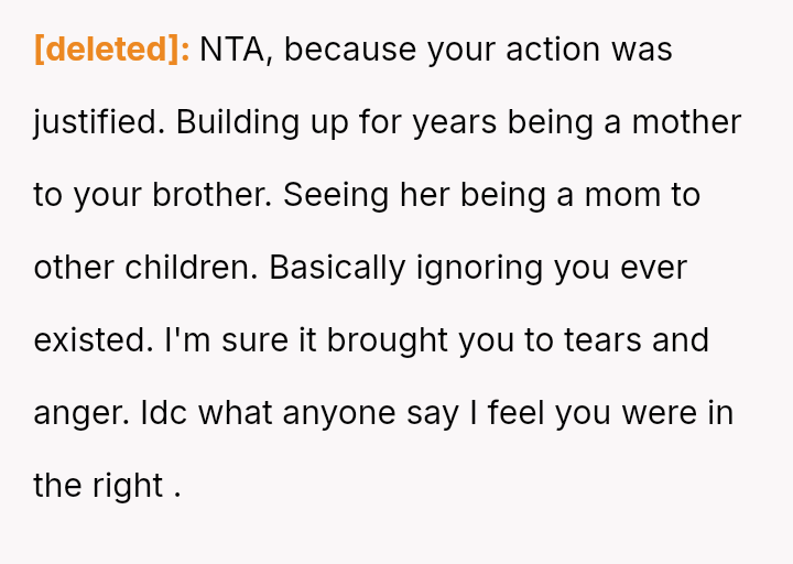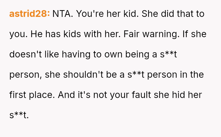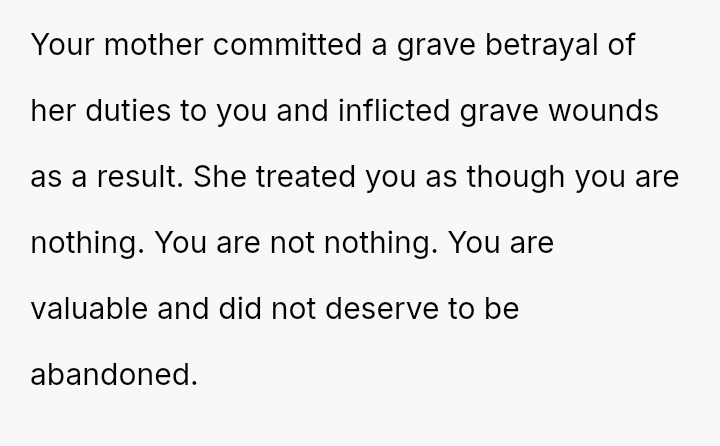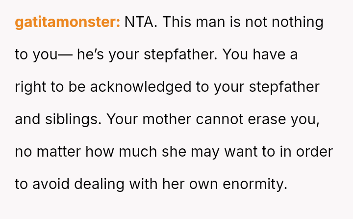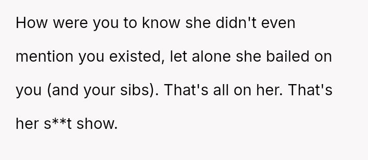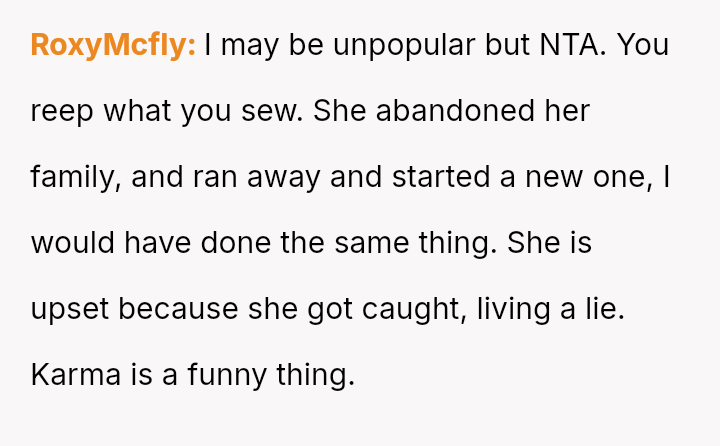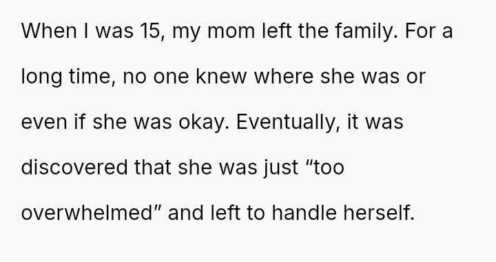 The recent discovery of the mother's new, seemingly s**ble life created a sharp conflict between the OP's unresolved pain and the es**blished secrecy of the mother's current family.