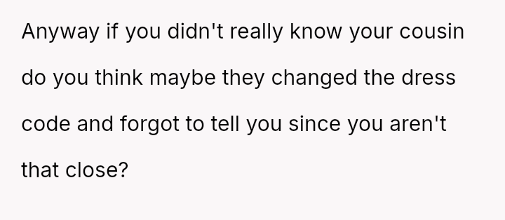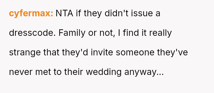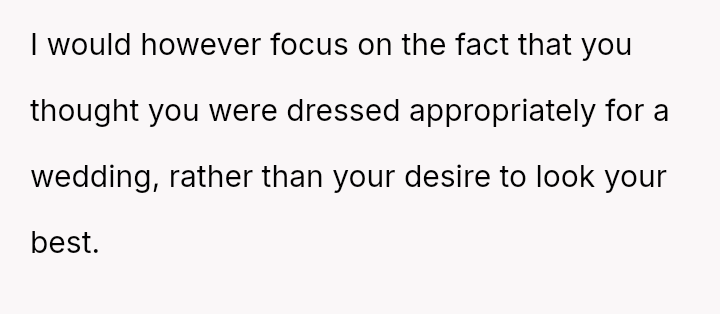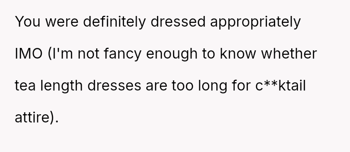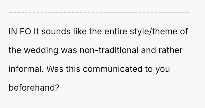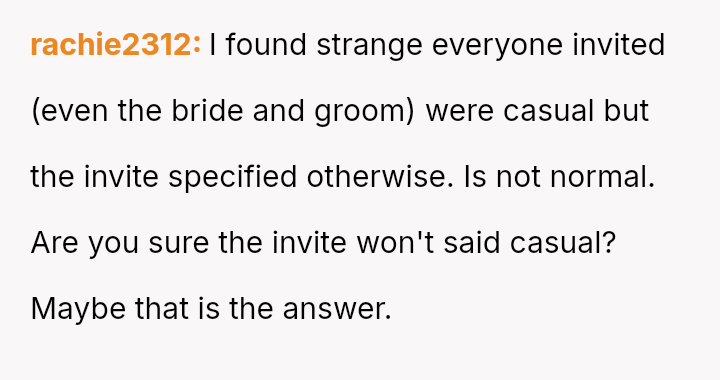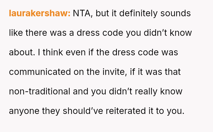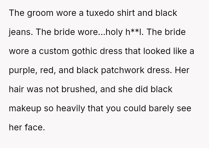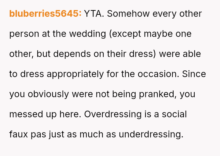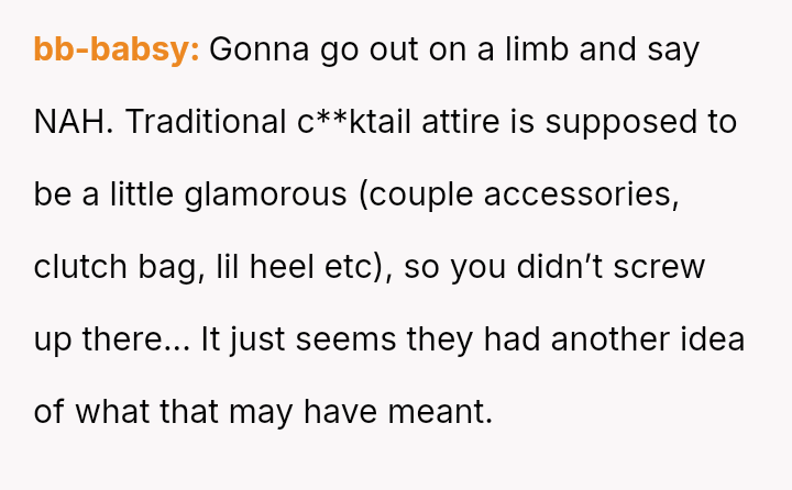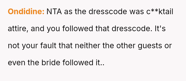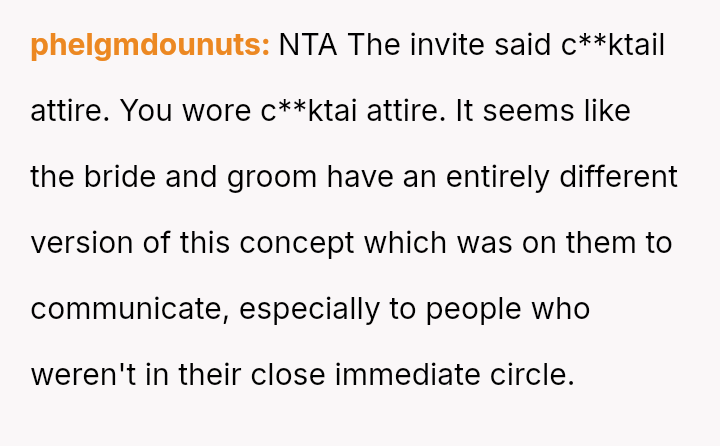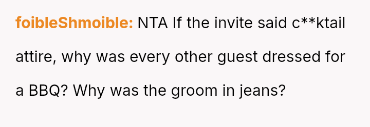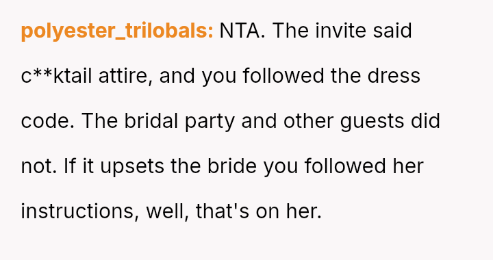 Given the discrepancy between the OP's dressing standards based on the invitation and personal history versus the actual, highly unconventional attire of the wedding party, was the OP obligated to lower their standard of presentation to match the low level of formality displayed by the bride, or was the bride responsible for clearly communicating the expected aesthetic when requesting c**ktail attire?