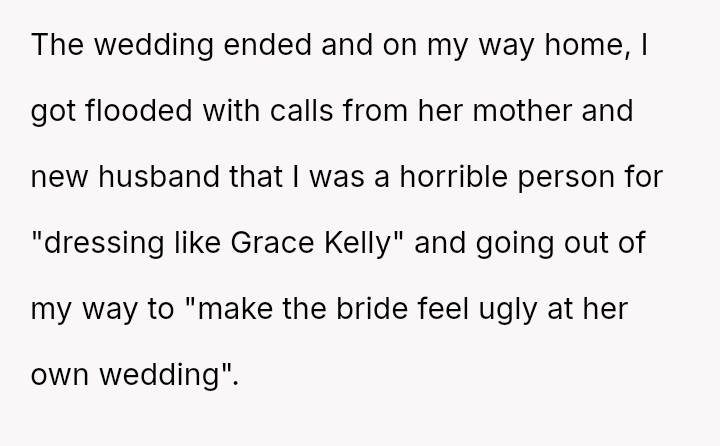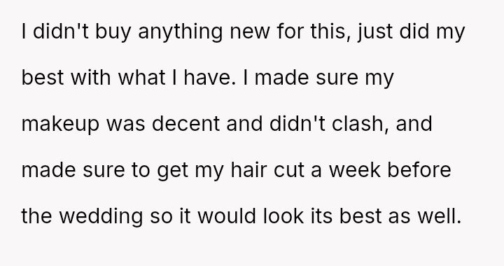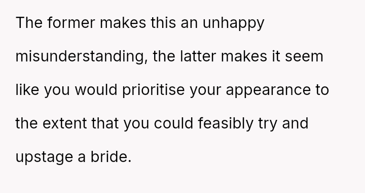 This effort, intended to show respect for the event and manage personal anxiety, resulted in the bride and her family feeling that the OP intentionally overshadowed the bride, creating intense conflict and accusation.