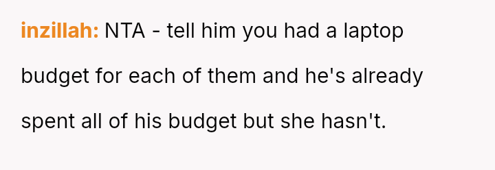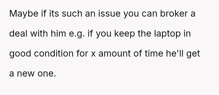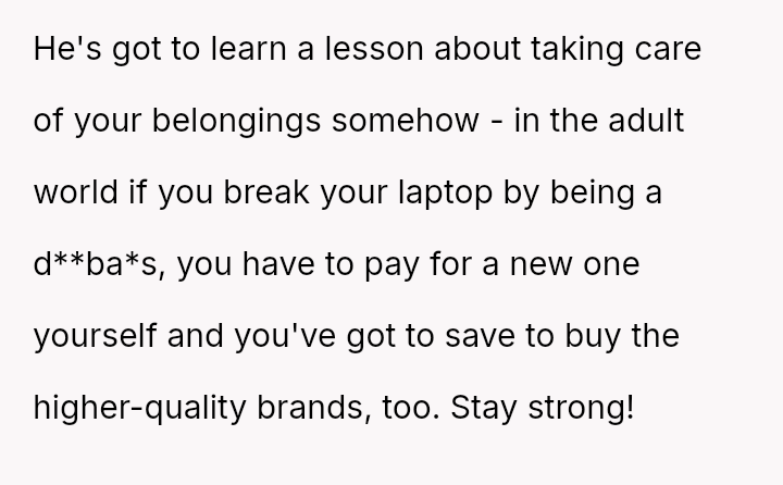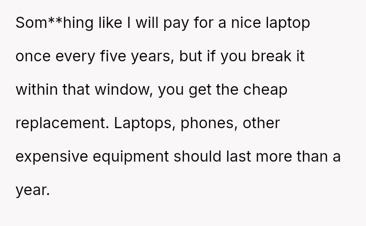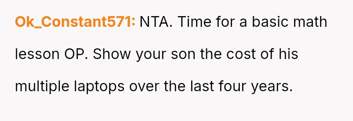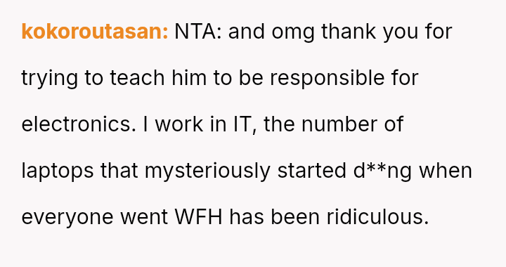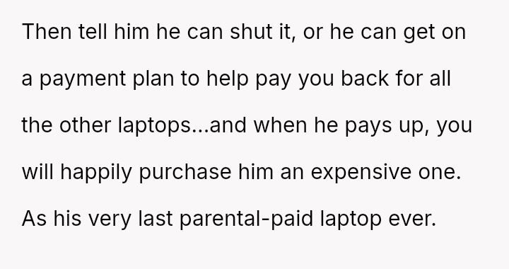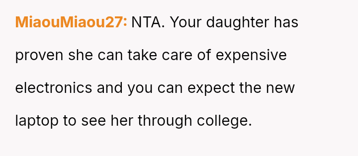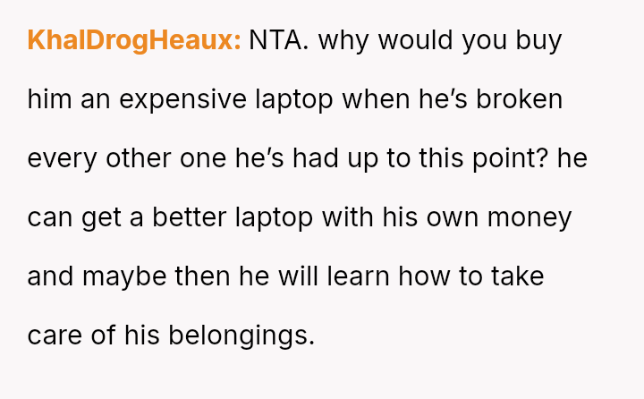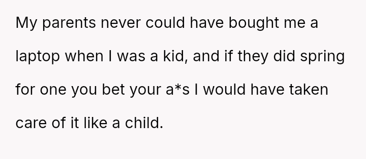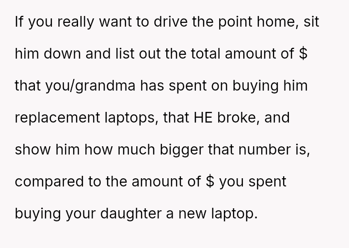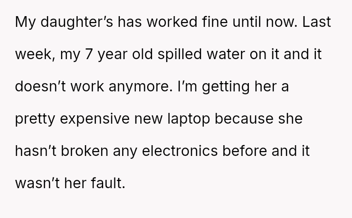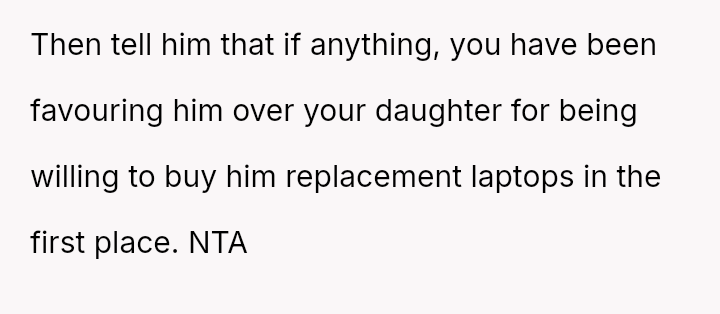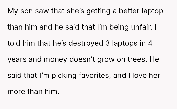 The parent is facing a conflict rooted in perceived favoritism after their son, who has a history of damaging electronics, reacted negatively to receiving a lesser replacement laptop compared to his sister.