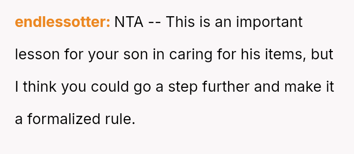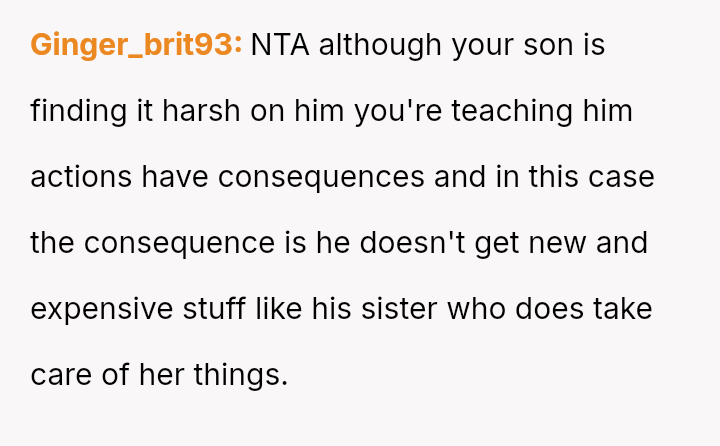 Is the parent justified in linking the quality of the replacement device directly to the son's history of carelessness, or does differentiating the replacement based on fault unfairly prioritize the daughter's needs and exacerbate the son's feeling of being unloved?