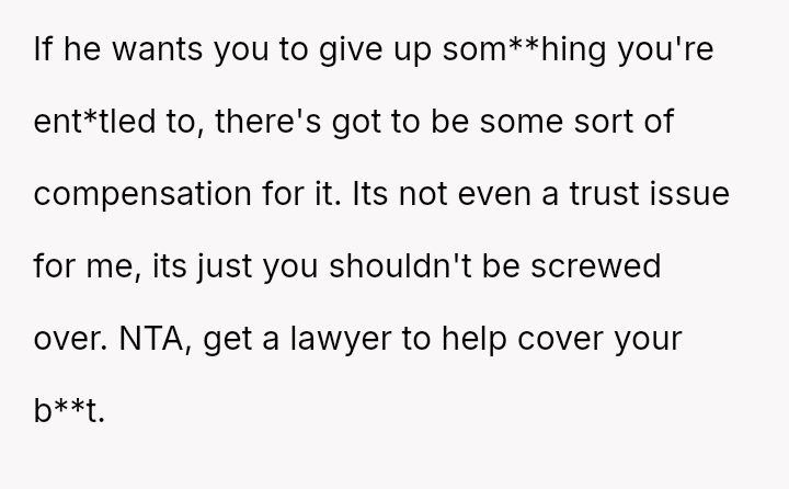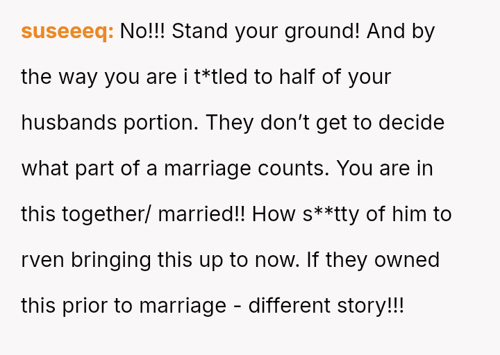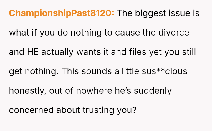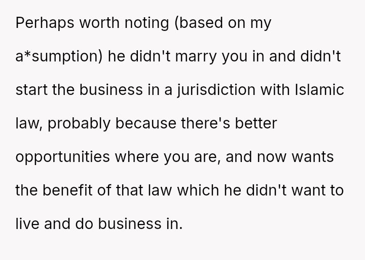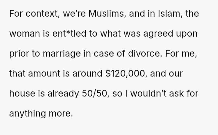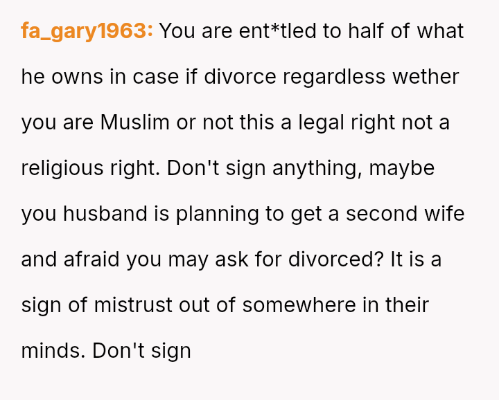 The original poster is facing a conflict between maintaining her husband's trust and protecting her es**blished legal and religious ent*tlements regarding marital a*sets.