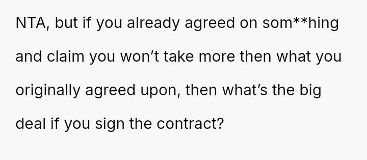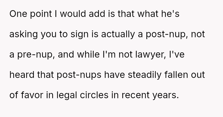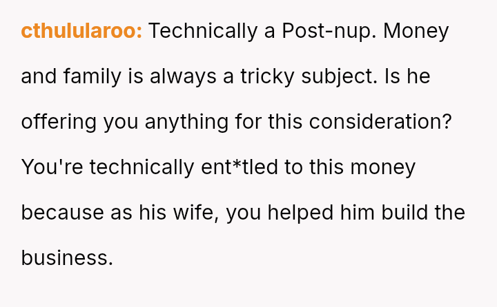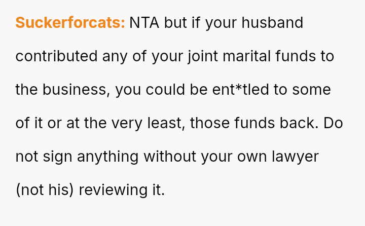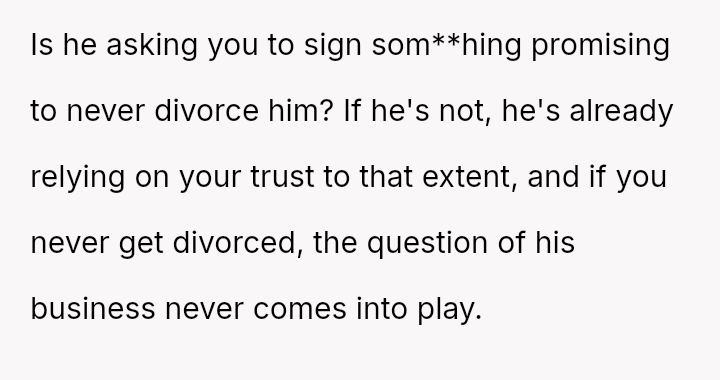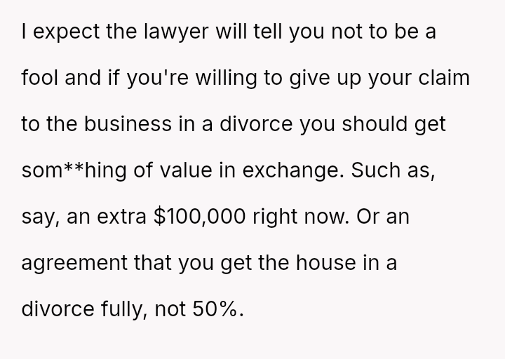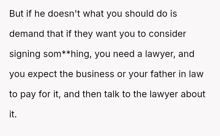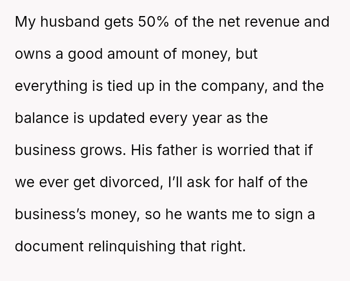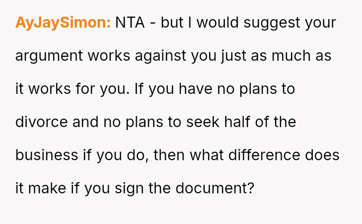 Is the original poster correct to refuse signing a document that waives her right to a share of the family business, based on the belief that her husband’s trust should suffice, or is she being unreasonable by not accommodating the concerns of her husband’s family regarding the business's future?