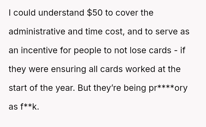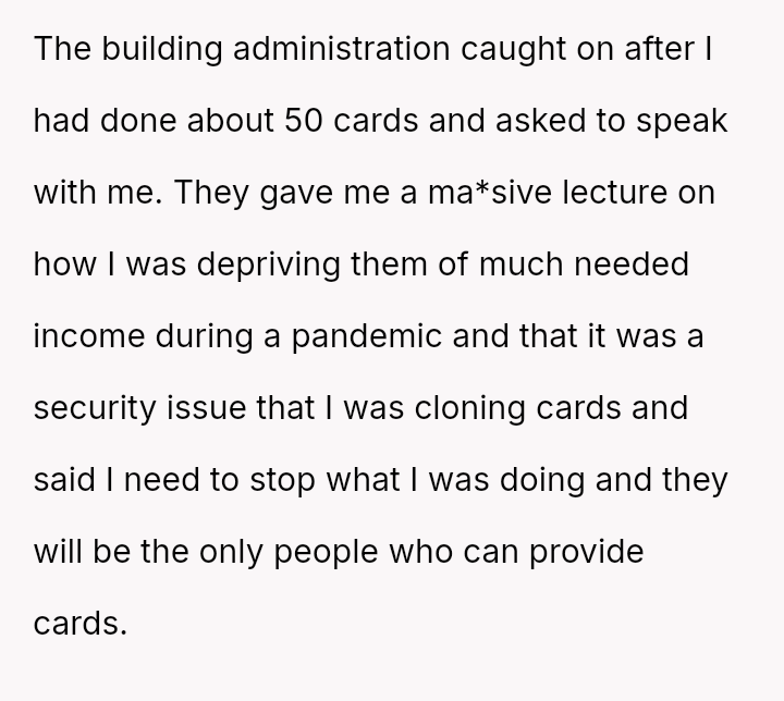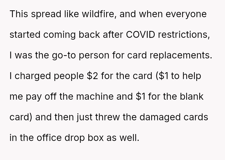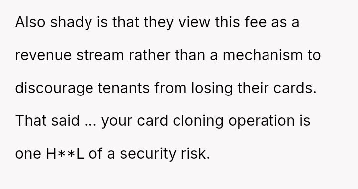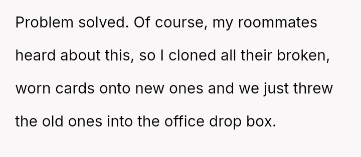 In response, the OP chose to bypa*s this policy by using technology to clone replacement cards for themselves and others at a minimal cost, essentially creating an unauthorized, affordable service.