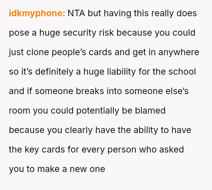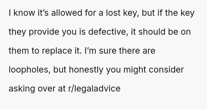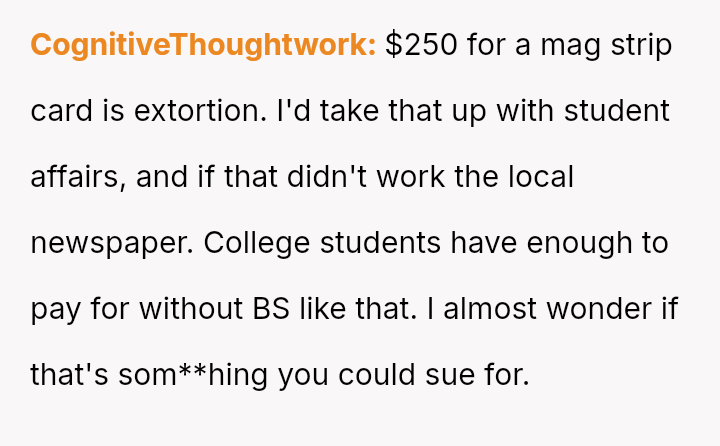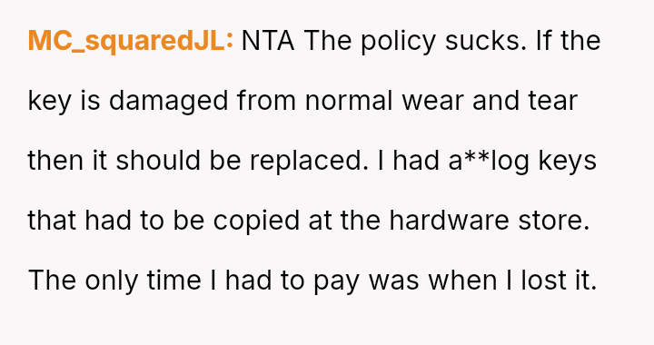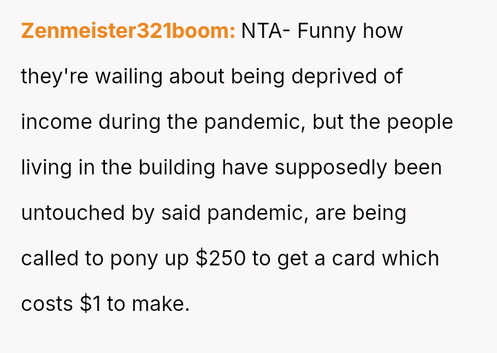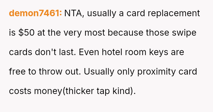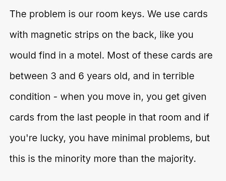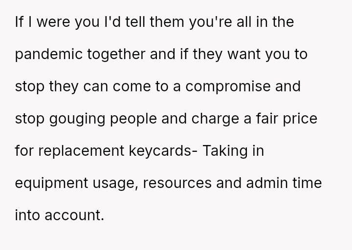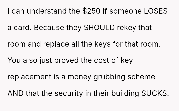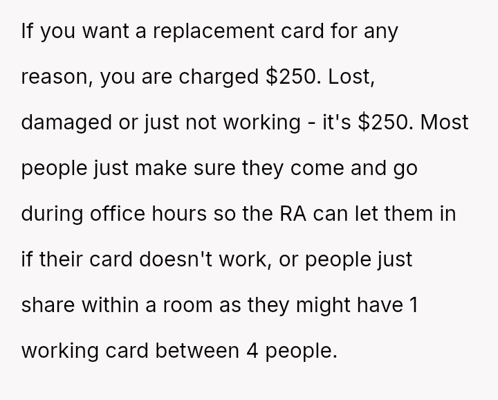The original poster (OP) faced a significant financial burden and practical difficulty due to the housing company's excessive $250 fee for replacing faulty, old key cards, which directly conflicted with their need to access their home after working late hours.