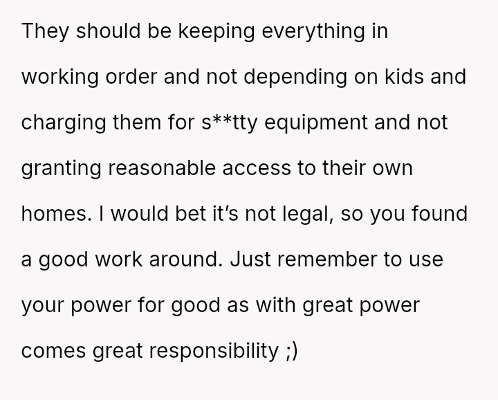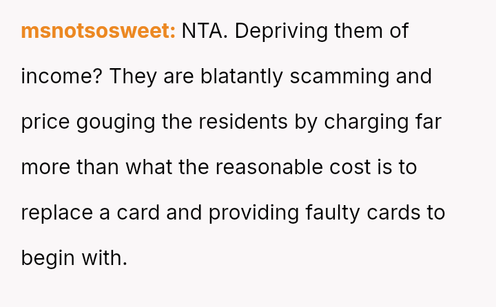 Was the OP justified in undermining the management's high-cost policy to provide necessary relief to fellow residents facing an unreasonable fee, or did their actions const*tute theft of service and a genuine security risk that warrants management's intervention?