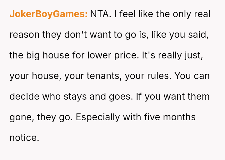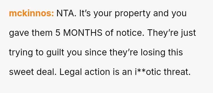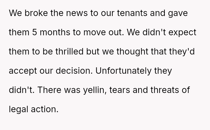 While legally ent*tled to reclaim their property with five months' notice, the OP is distressed by the tenants' extreme negative reaction, which included yelling and threats, leading them to question the morality of their necessary decision.