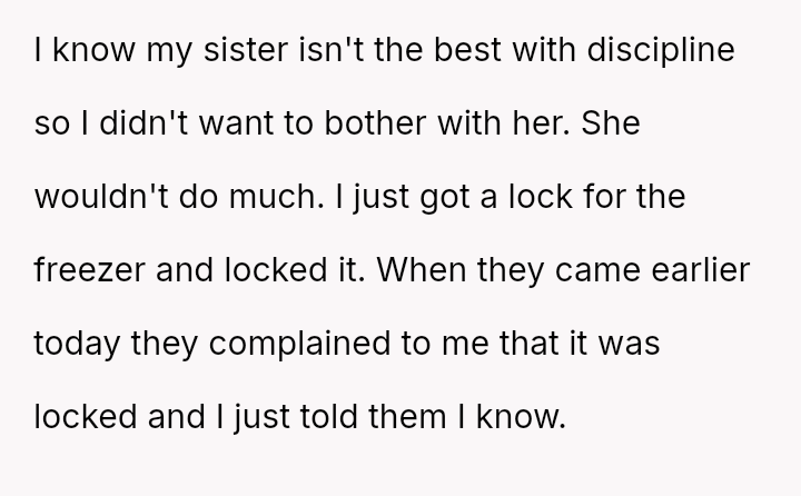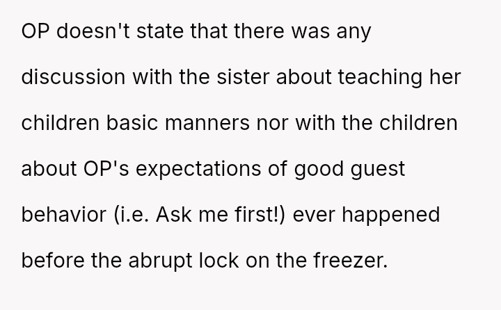 Was the OP justified in placing a lock on the freezer to prevent the children from taking excessive amounts of food, or did this action escalate the situation unnecessarily and const*tute unfair treatment toward their sister's family?