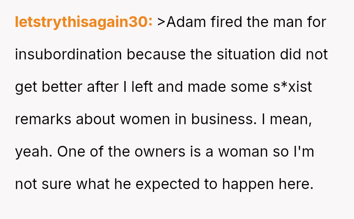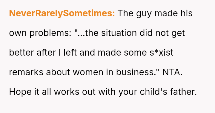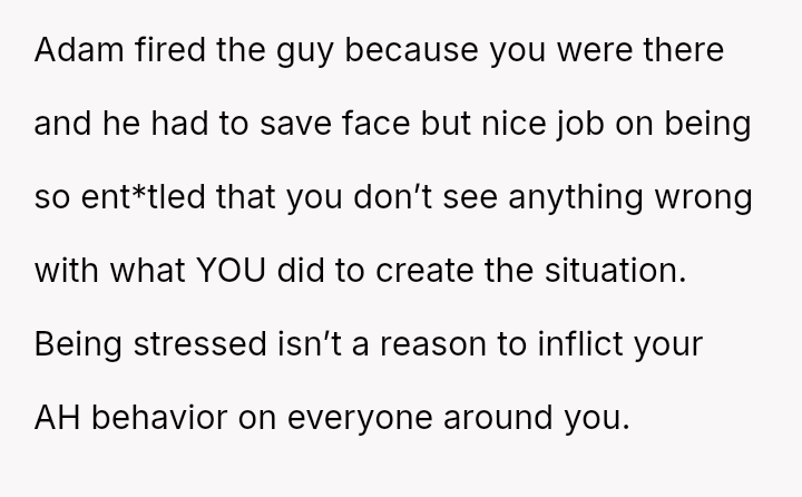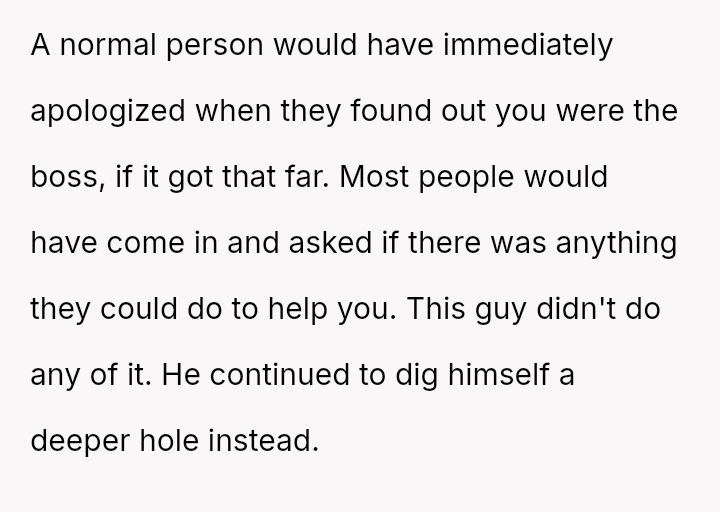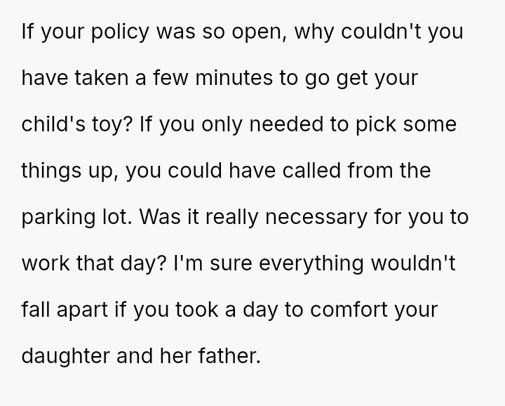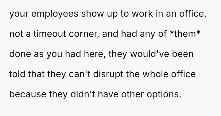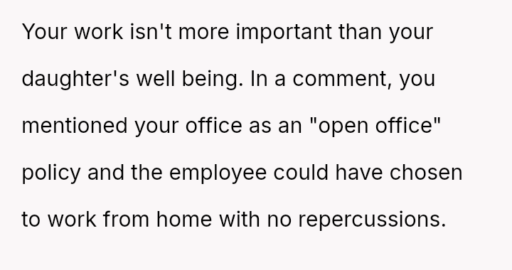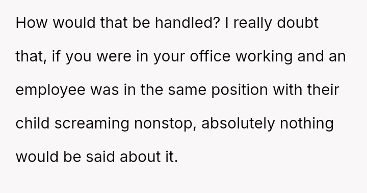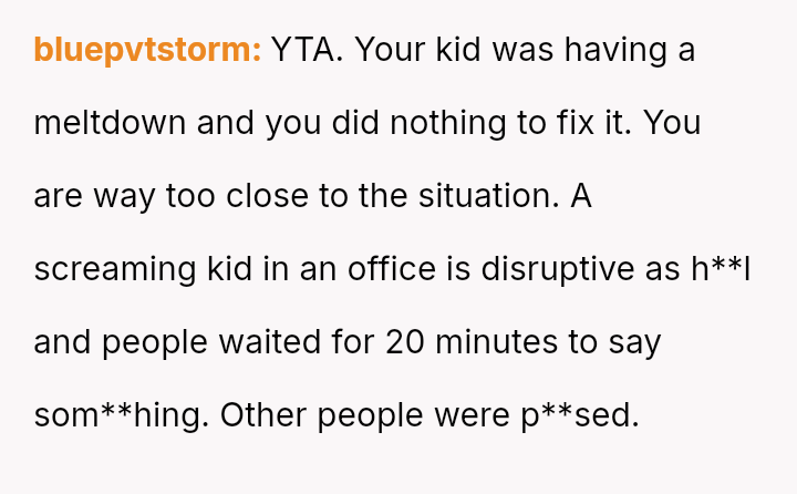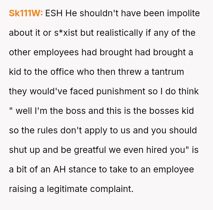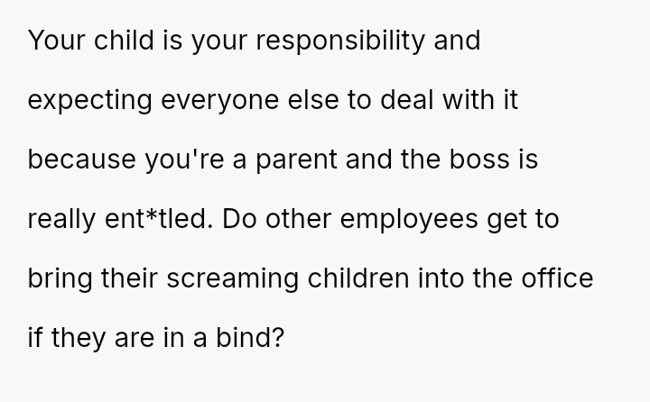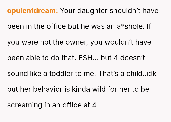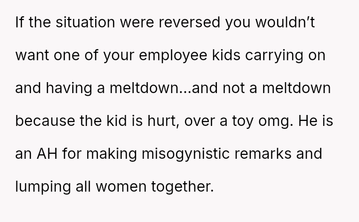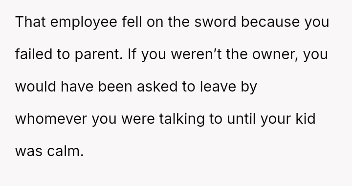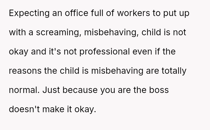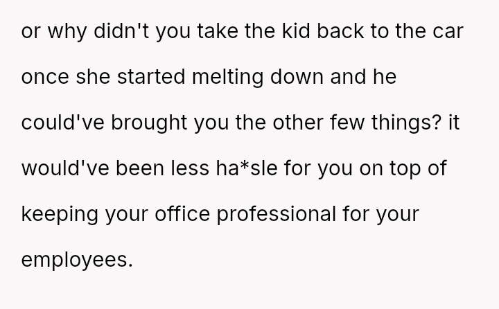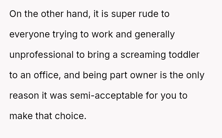 Her actions, though defensive and sharp, stemmed from the stress of the situation and the perceived insult to her role as both a parent and a co-owner, directly clashing with the expectation of professional workplace decorum.
