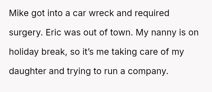 The owner faced an intense conflict, balancing the immediate crisis of co-parenting an upset child while handling urgent business needs due to a partner's injury.