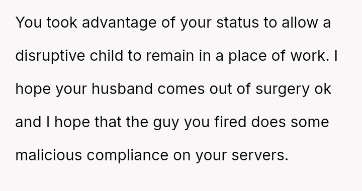 Is it acceptable for an owner to use their authority to immediately terminate an employee for disrespectful behavior toward them and their child in a high-stress scenario, or should workplace policy dictate a more structured disciplinary process even when the initial provocation involves personal family matters?