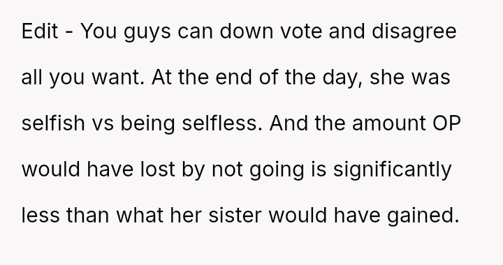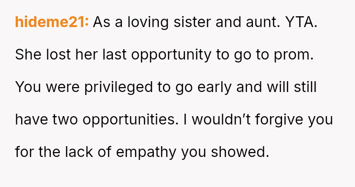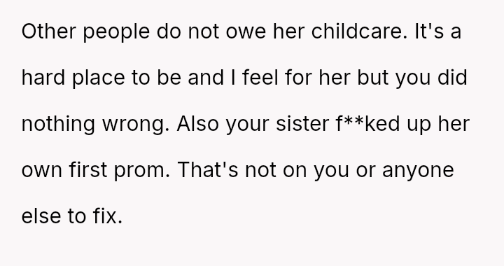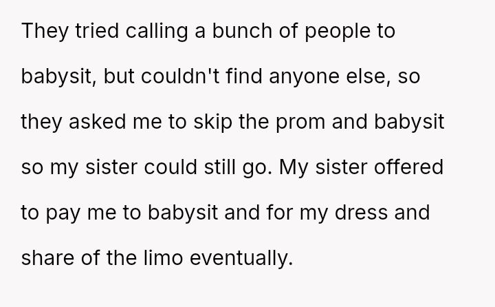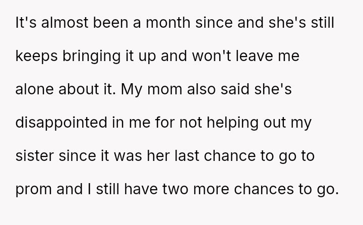 Given the OP's desire to maintain friendships versus the family expectation of sacrifice for a sibling's special event, is it reasonable for the sister and mother to continue pressuring the OP when the OP had already made a significant sacrifice by attending prom with senior friends, or should the family accept the OP's decision as a valid prioritization of their own experience?