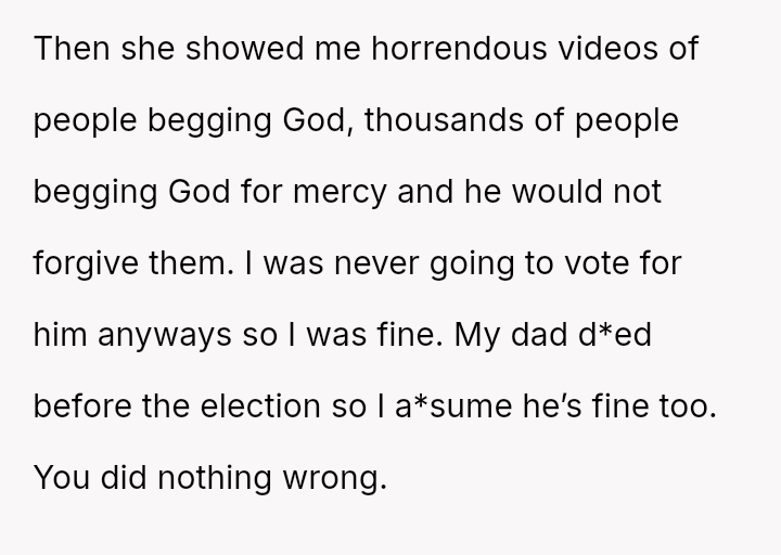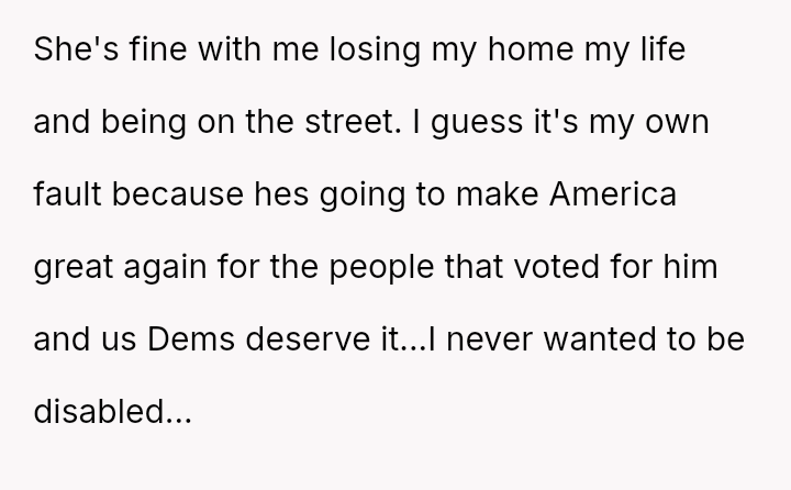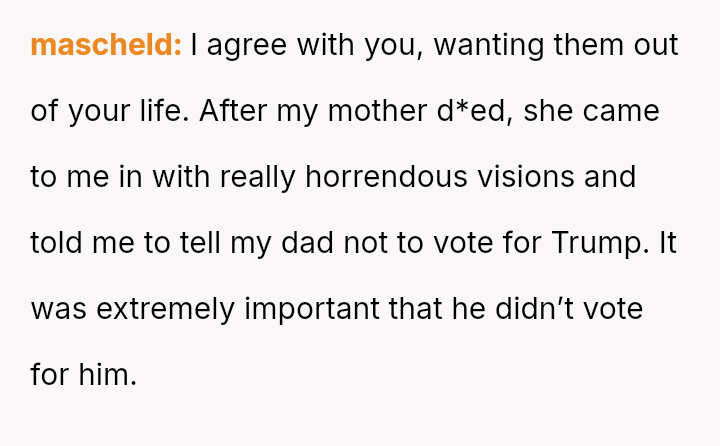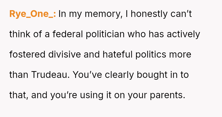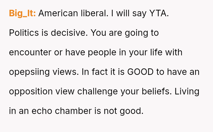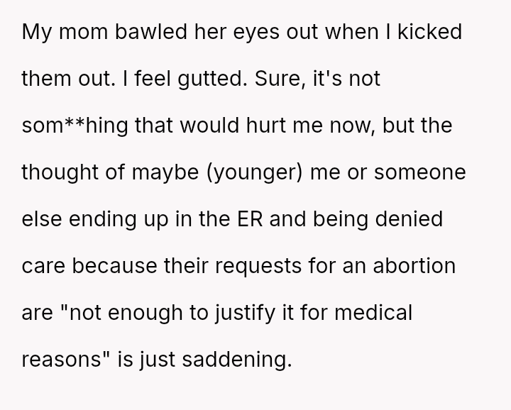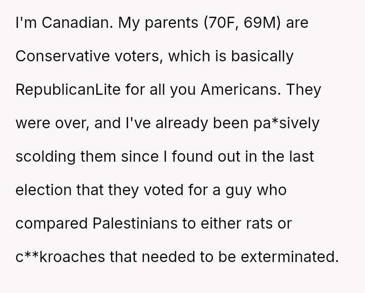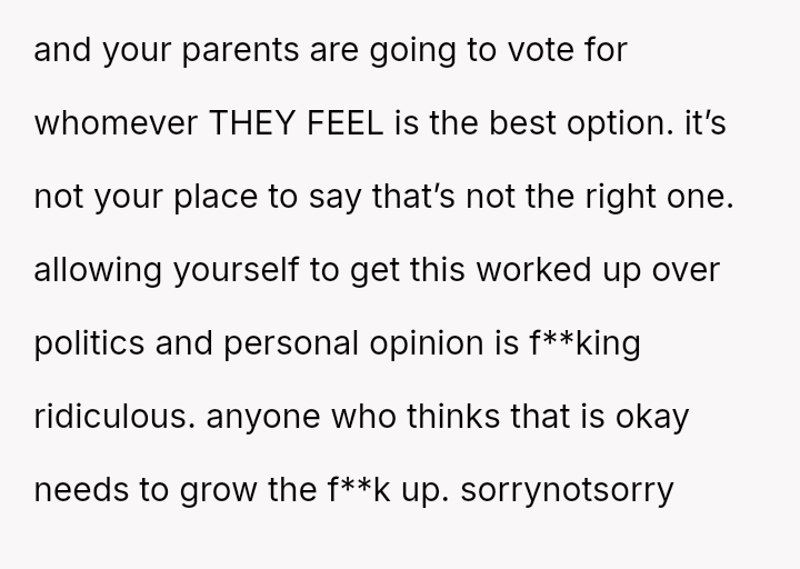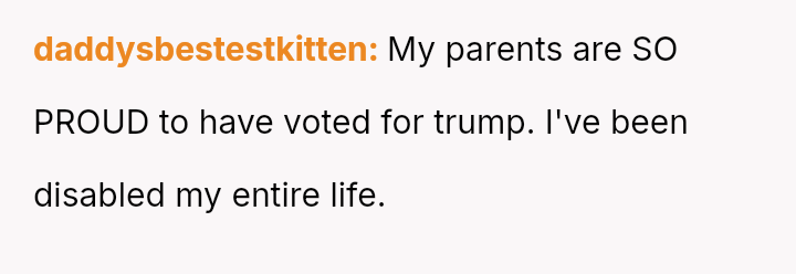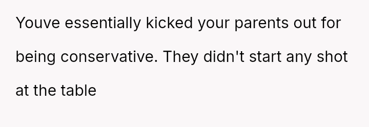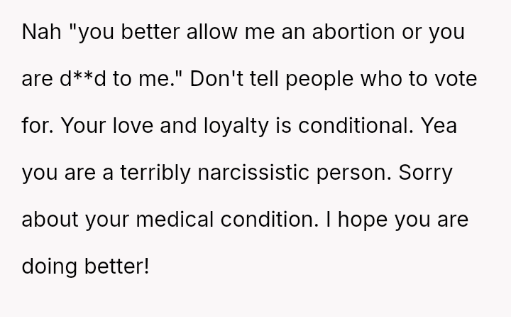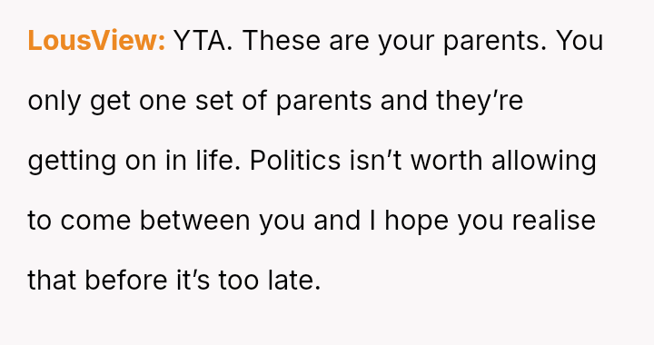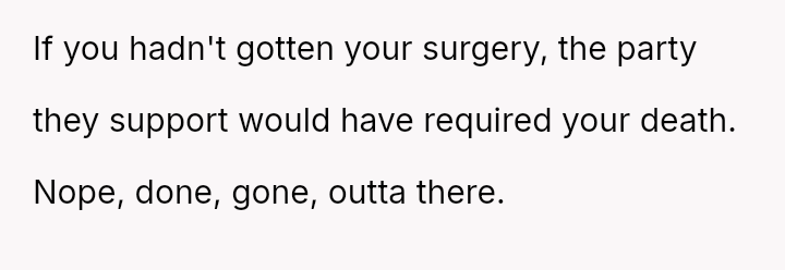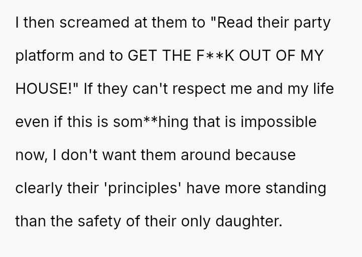 The original poster (OP) reached an emotional breaking point, demanding her parents leave after a severe political disagreement rooted in her life-threatening medical condition.