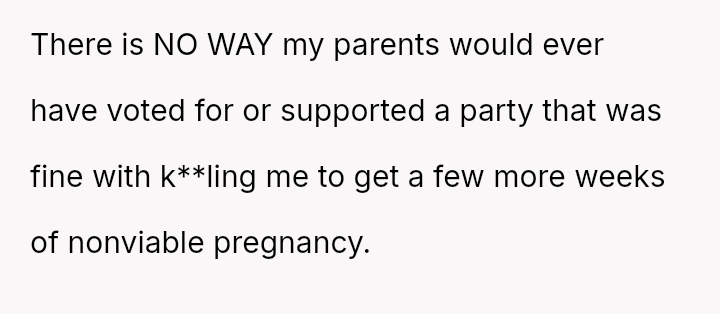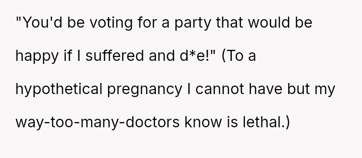 Her conflict stems from her parents prioritizing their political affiliation over acknowledging the real danger that restrictive reproductive policies pose to her specific health needs, even though she is no longer at risk of pregnancy.