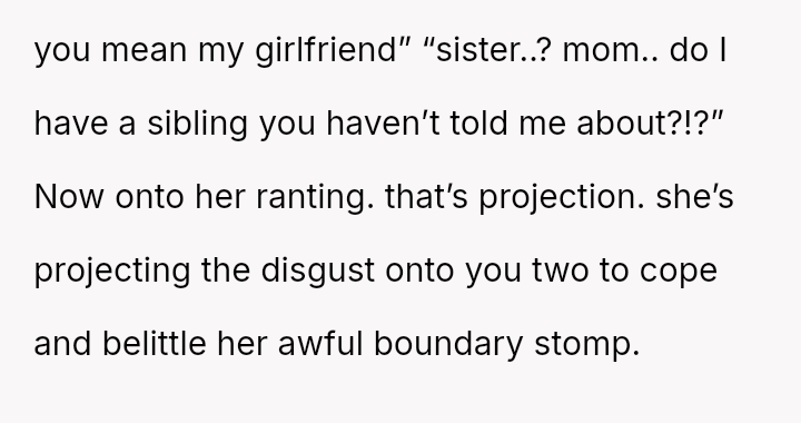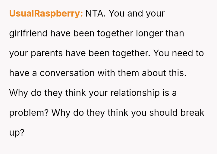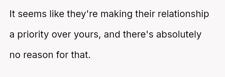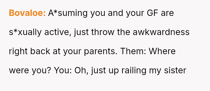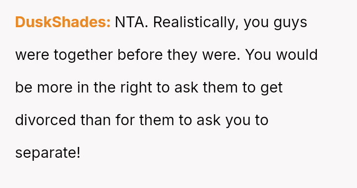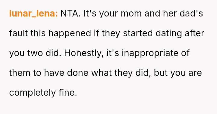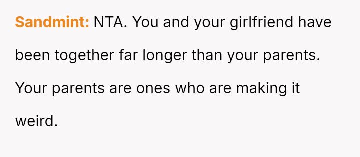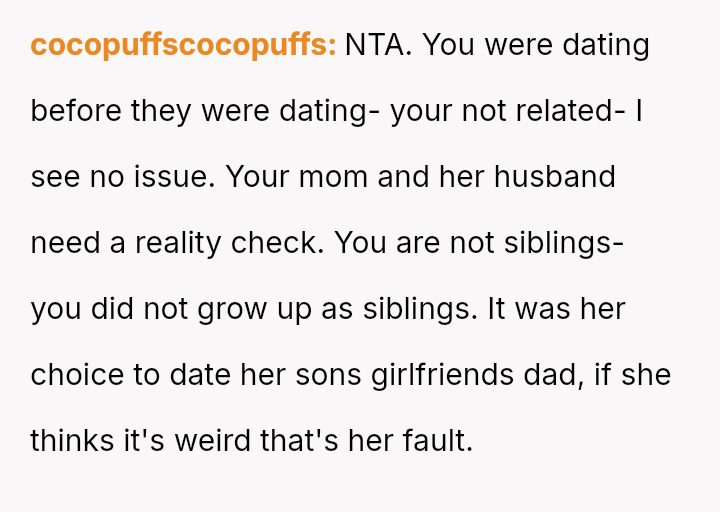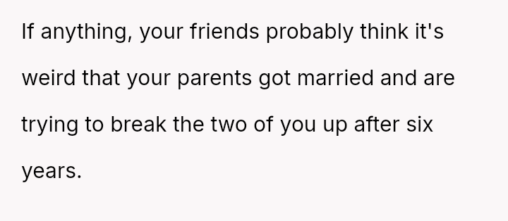 The central question remains whether it is inappropriate for two committed adults to continue a relationship while living under the same roof as their newly married parents, especially when the external pressure, rather than their own feelings, is the primary threat.