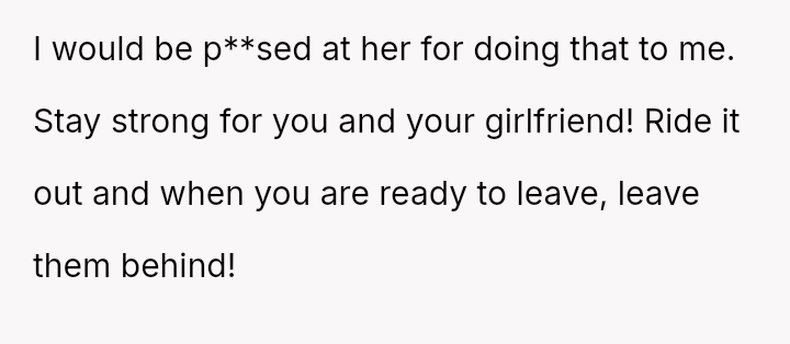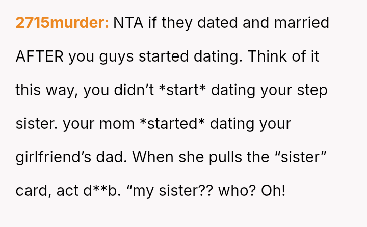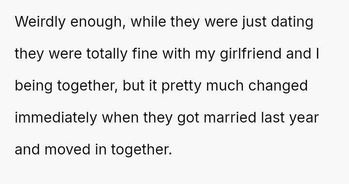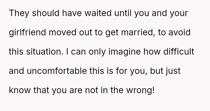 The original poster (OP) and his long-term girlfriend are experiencing significant emotional distress due to their parents' marriage, which has suddenly placed them in the awkward and uncomfortable position of living together as step-siblings.
