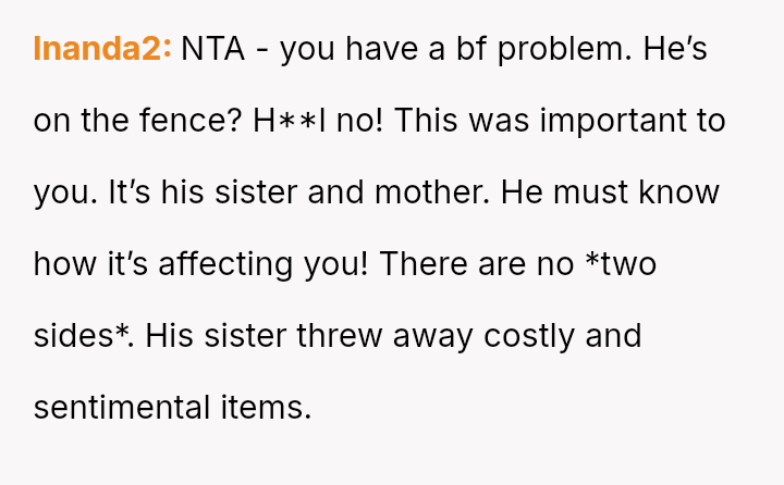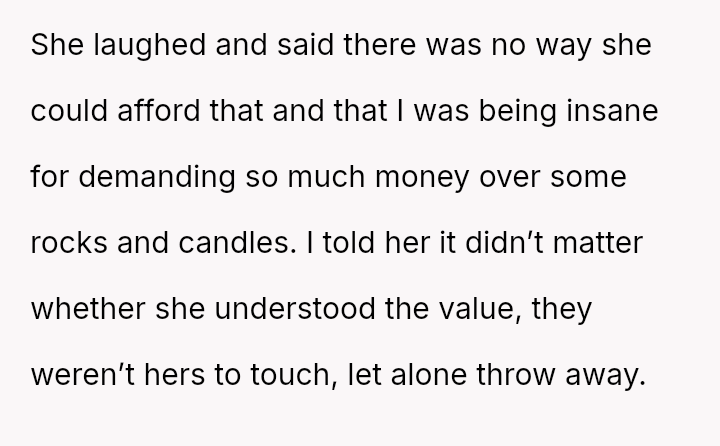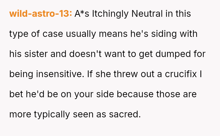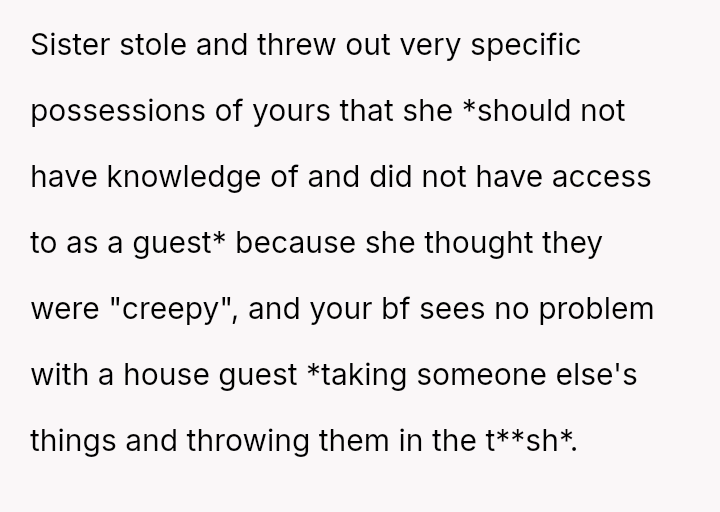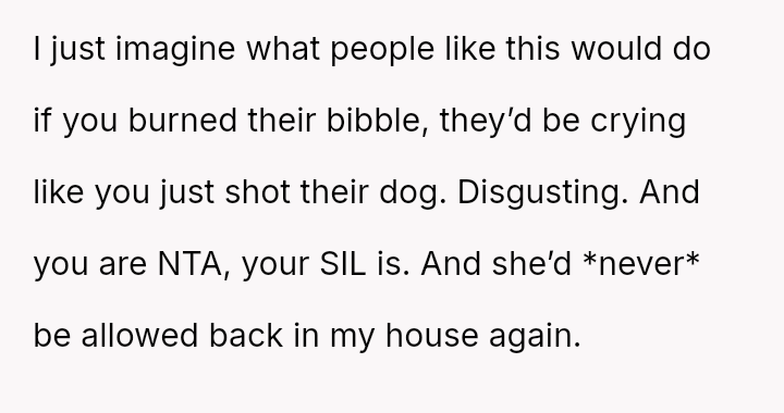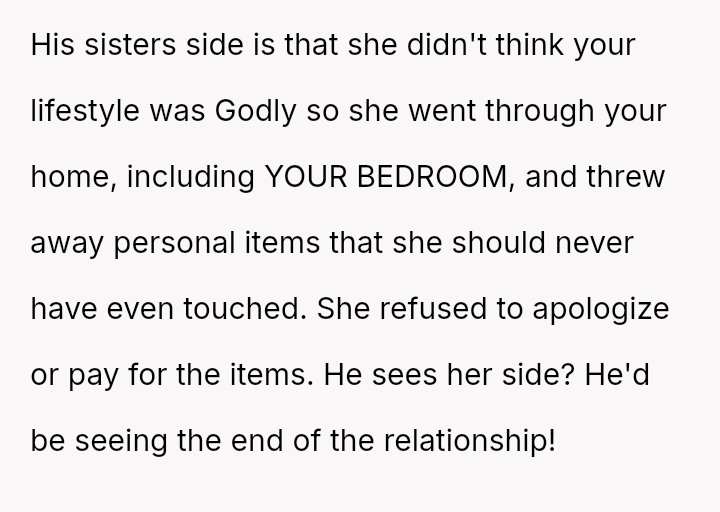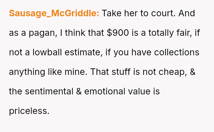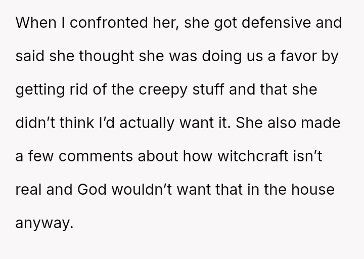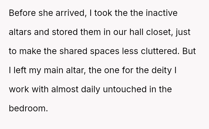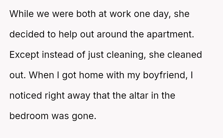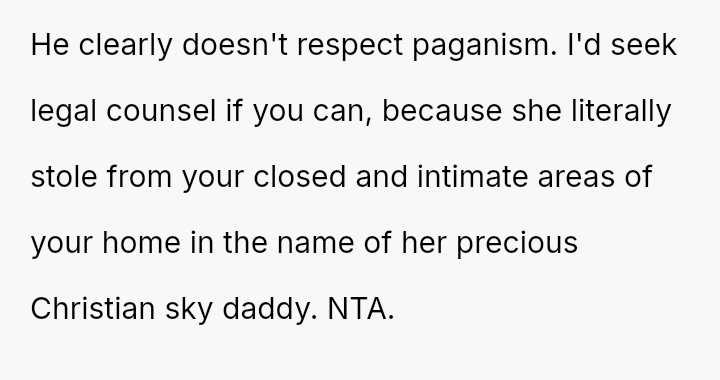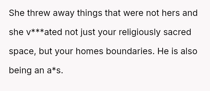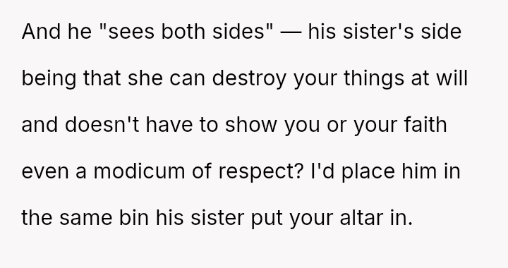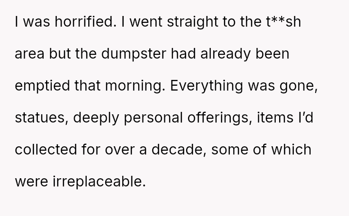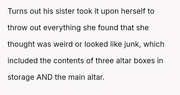 The original poster experienced a significant v***ation of personal property and spiritual space when her sister-in-law destroyed valuable and sentimental altar items.