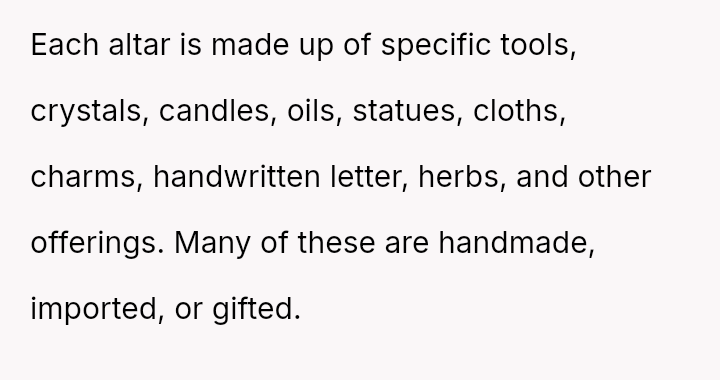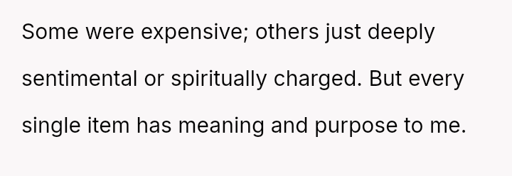Every carefully curated item—crystals, candles, handwritten letters—holds a fragment of her heart and spirit, a deeply personal dialogue with the divine that anchors her very existence.