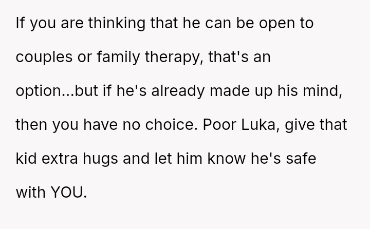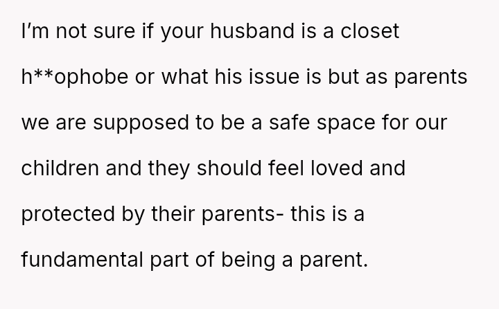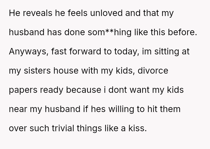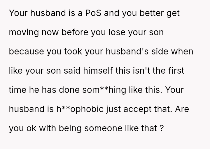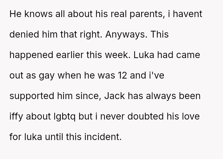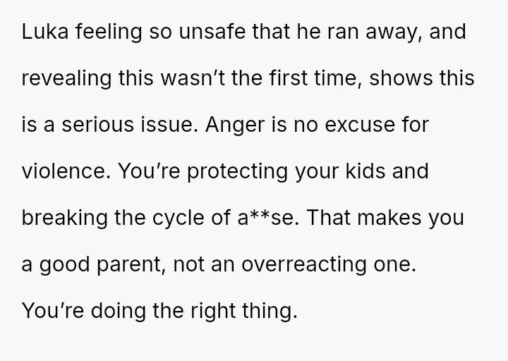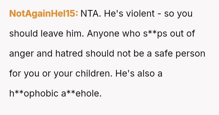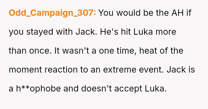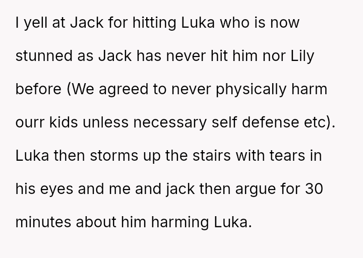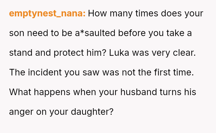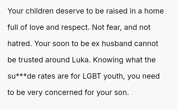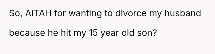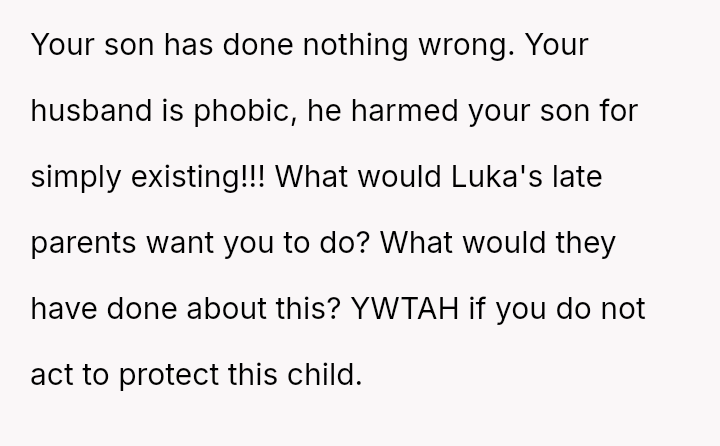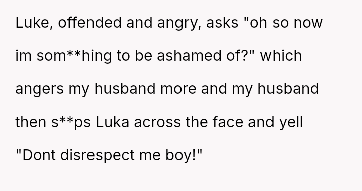 The original poster (OP) is facing a severe conflict between her commitment to protecting her children from physical harm and her husband's recent act of striking their 15-year-old son, Luka, following a confrontation about Luka's s*xual orientation and public affection.