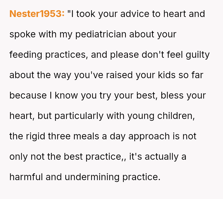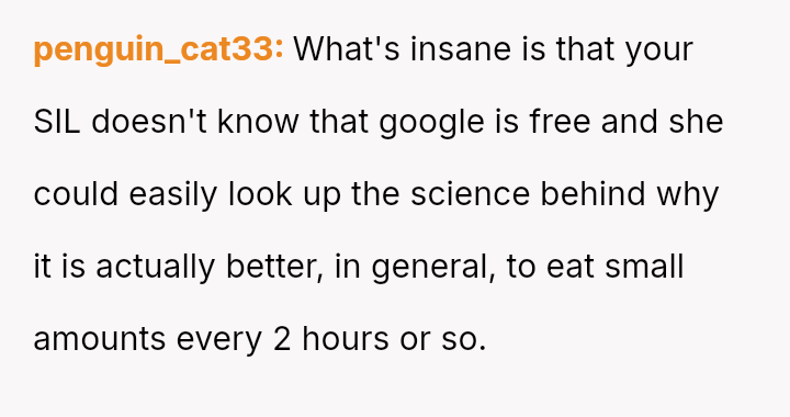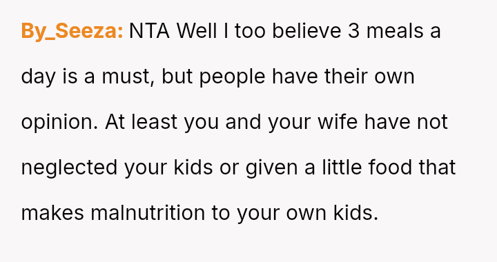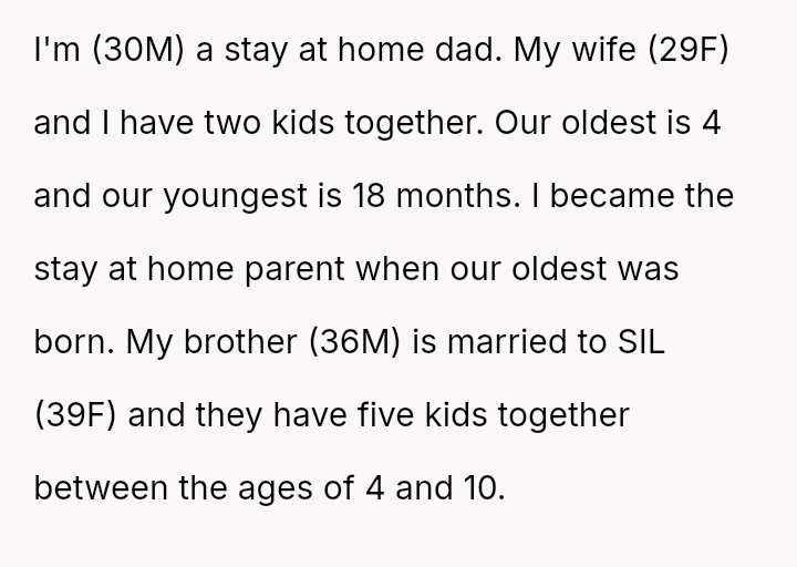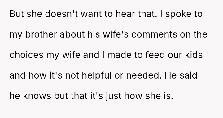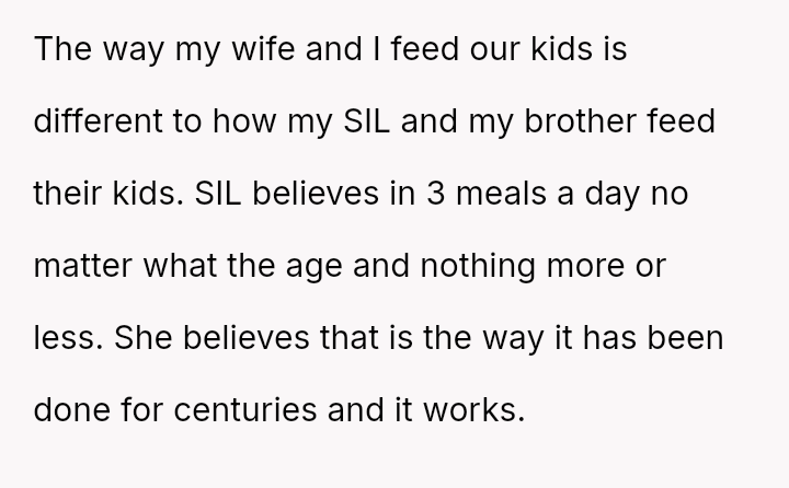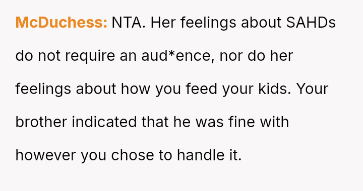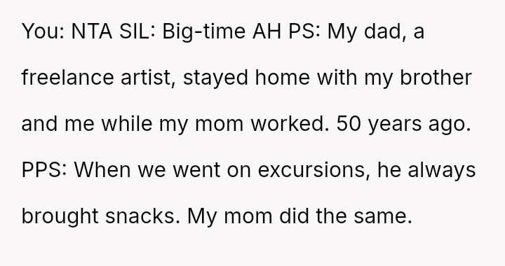 The original poster (OP) is feeling defensive and frustrated due to constant criticism from their sister-in-law (SIL) regarding their non-traditional role as a stay-at-home father and their specific child-rearing choices, particularly feeding schedules.