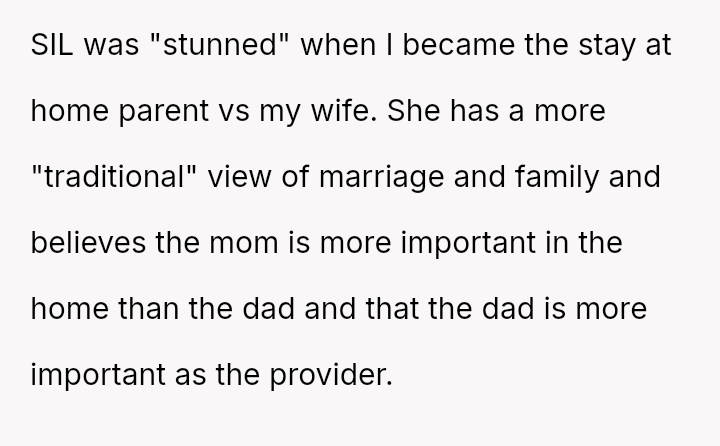 The central conflict lies between the OP's es**blished, collaborative parenting decisions with their wife and the SIL's rigid, traditional expectations, which the OP met with a harsh confrontation when the criticism escalated.