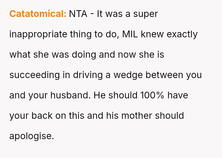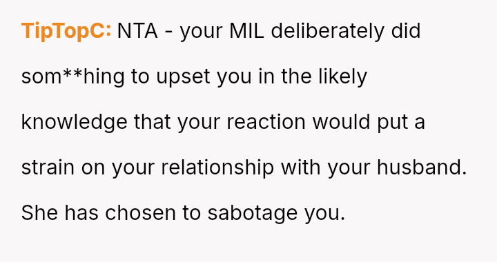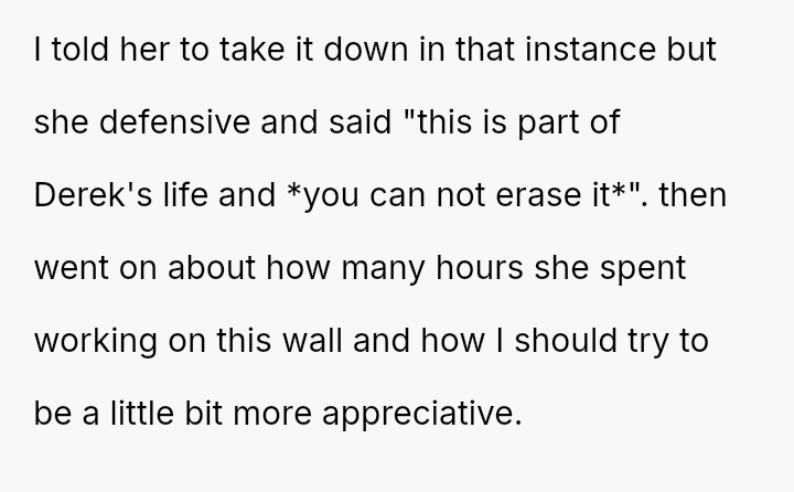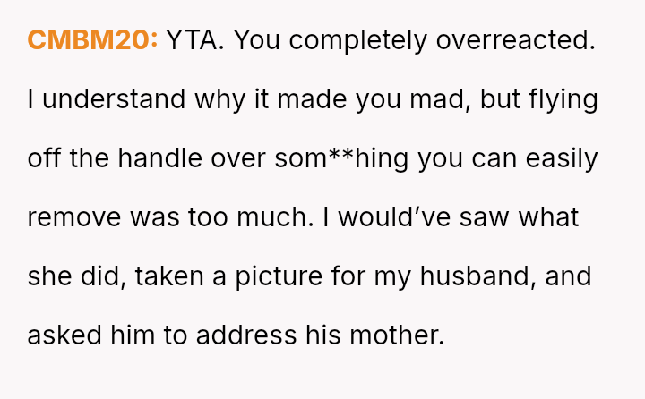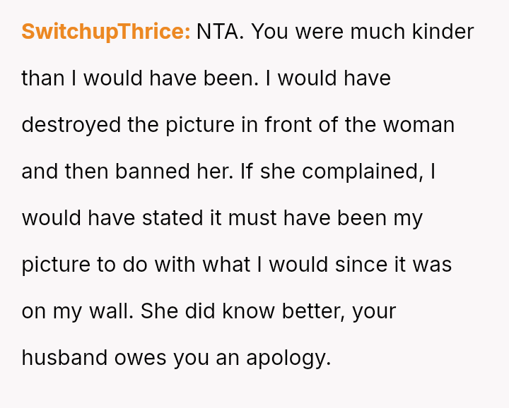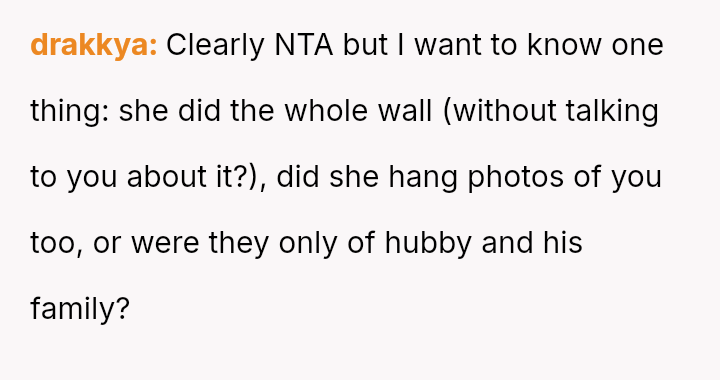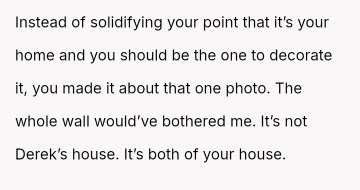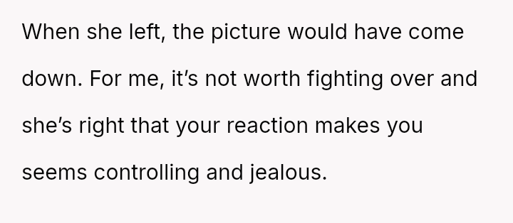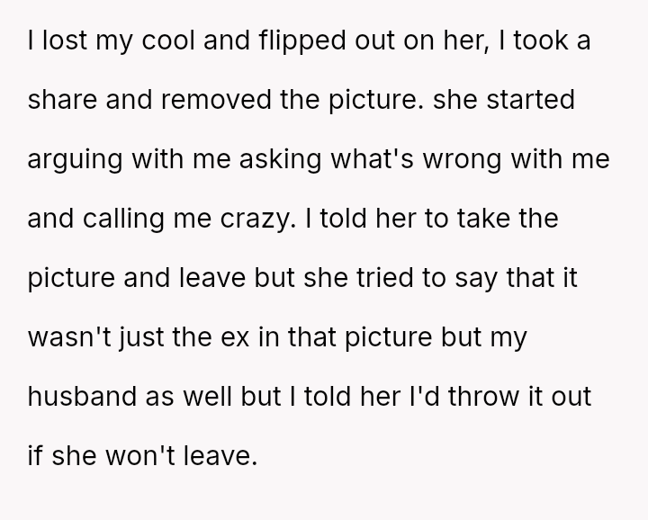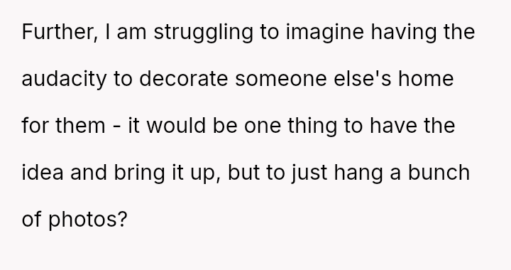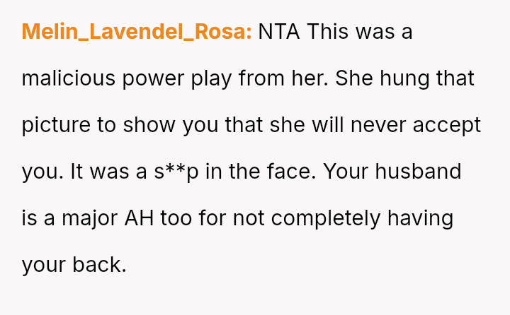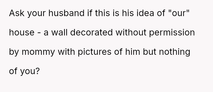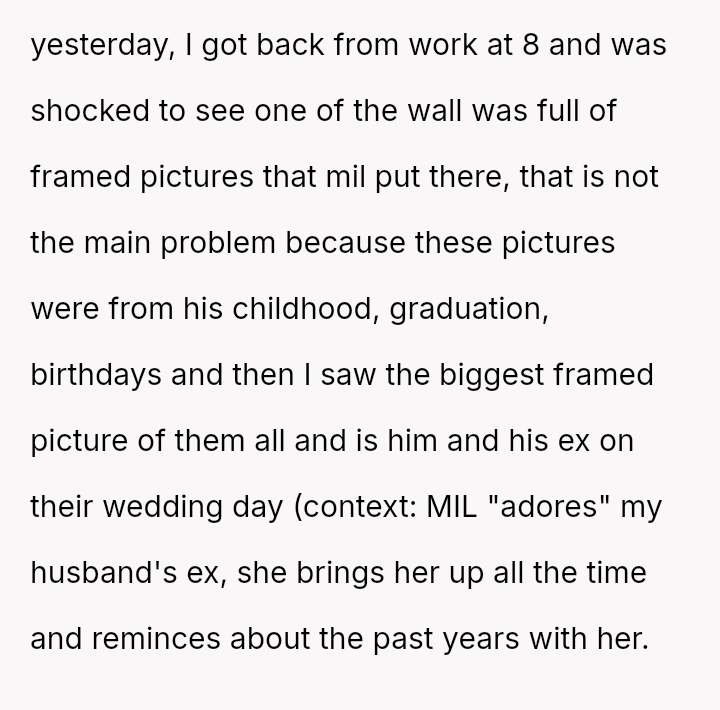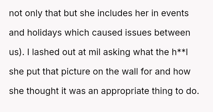 The original poster experienced a severe v***ation of personal boundaries when her mother-in-law deliberately displayed a prominent wedding photo featuring her husband and his ex-partner in their new home.