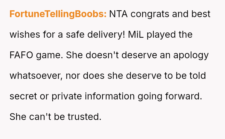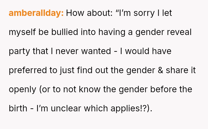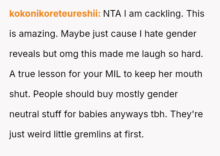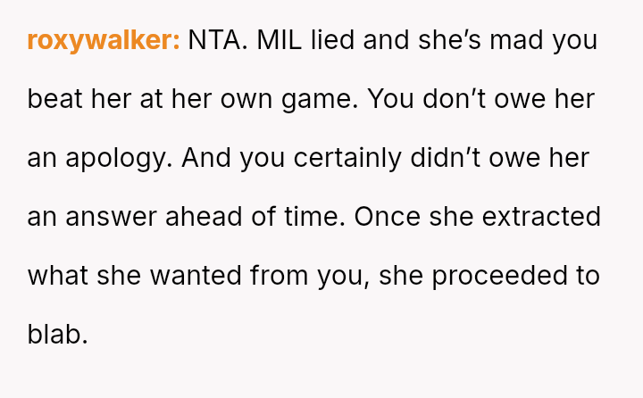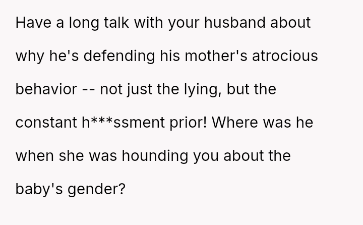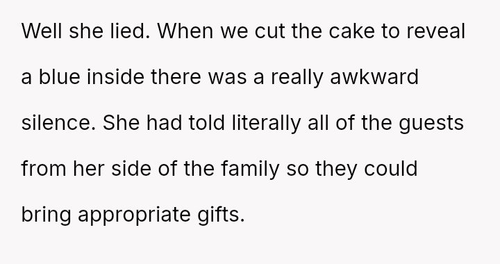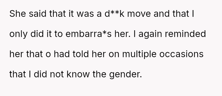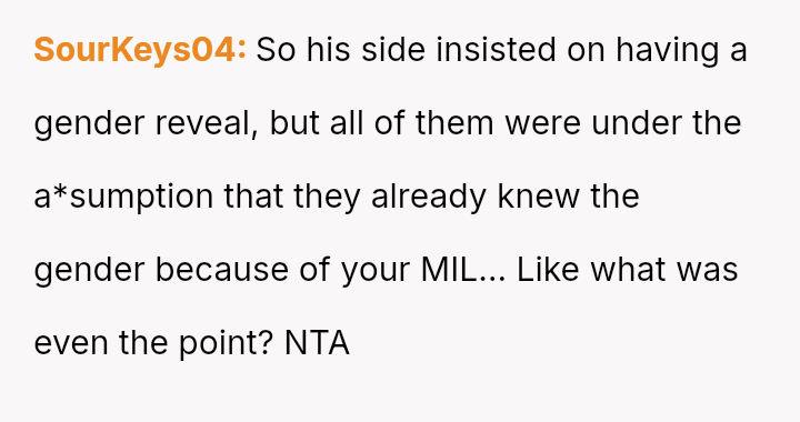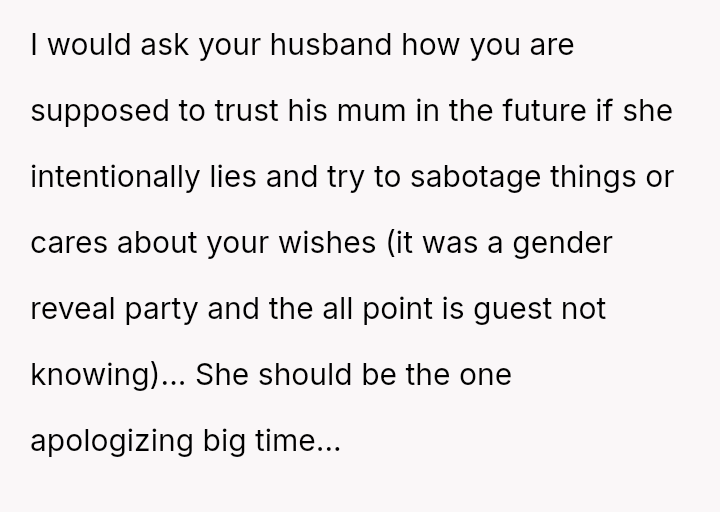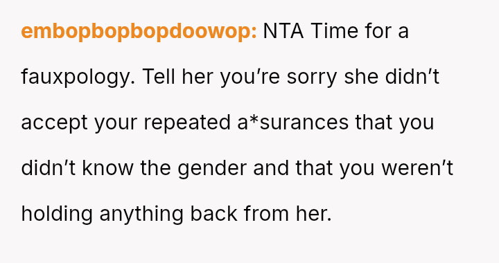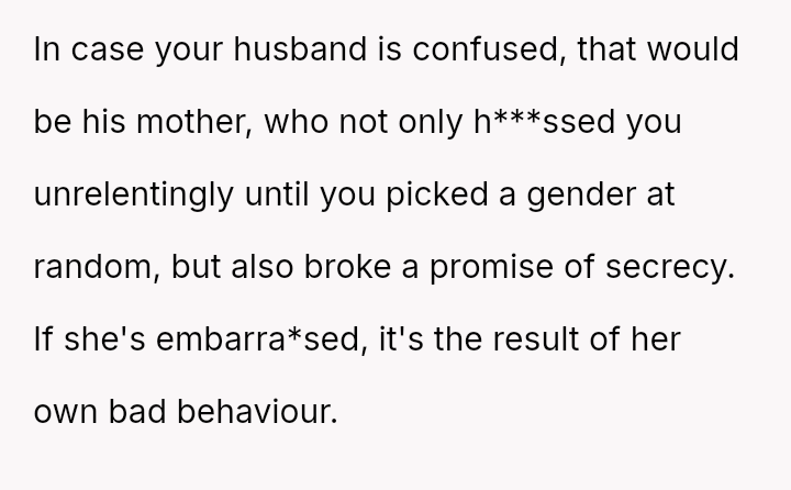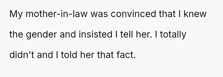 Despite being honest about not knowing the s*x initially, the OP yielded to the mother-in-law's persistent demands, only for the mother-in-law to immediately v***ate that trust and then blame the OP for the resulting embarra*sment.