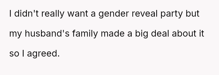 The original poster (OP) felt pressured into agreeing to a gender reveal party they did not want, leading to a conflict rooted in a broken promise regarding confidentiality about the baby's gender.
