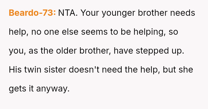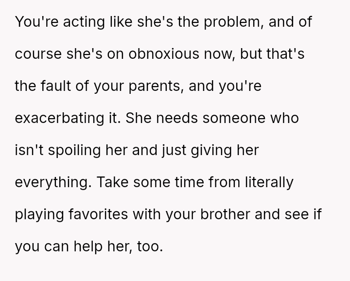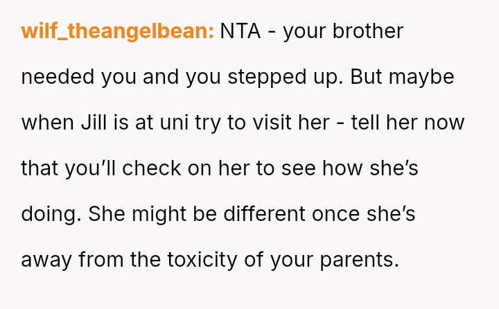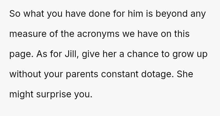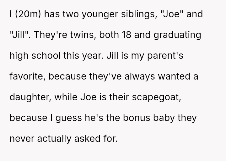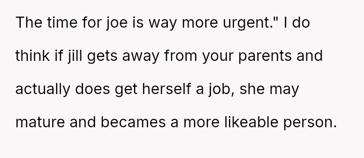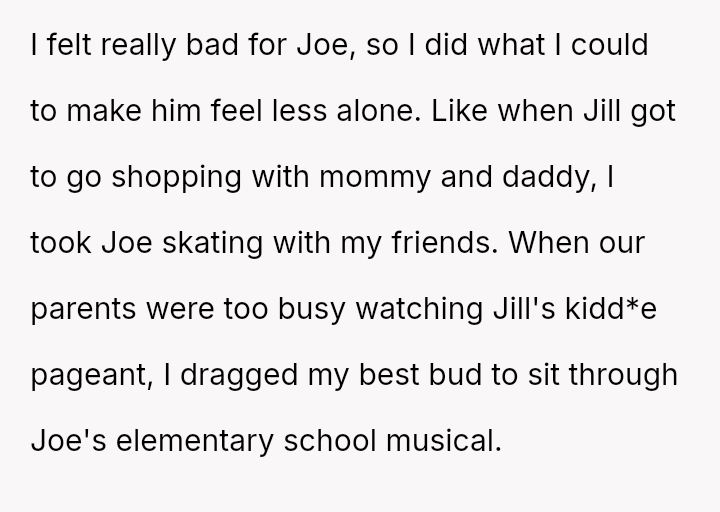 Given the OP's es**blished pattern of favoring the less-favored sibling, is it reasonable for the OP to deny Jill the same type of external support they actively sought for Joe, or does this favoritism, even when directed at balancing perceived parental neglect, const*tute unfair treatment toward Jill?