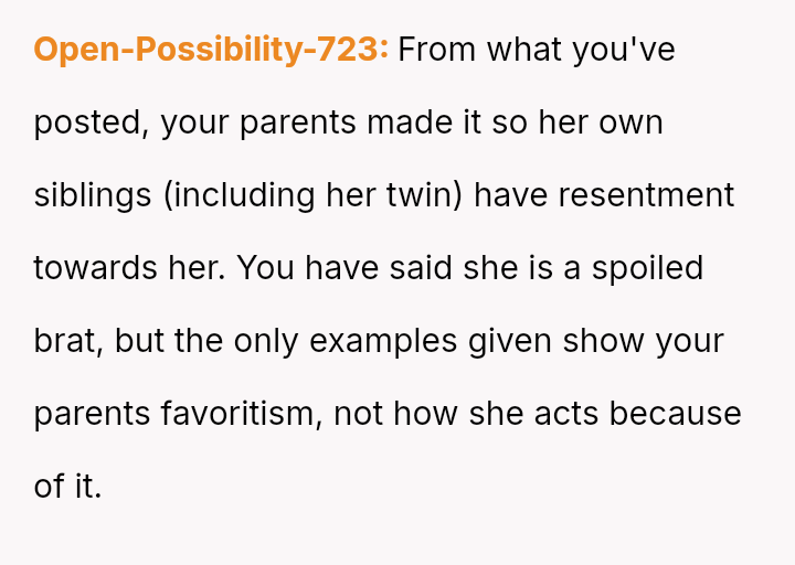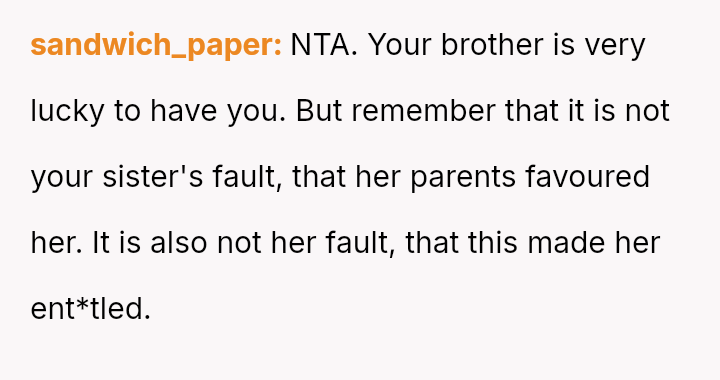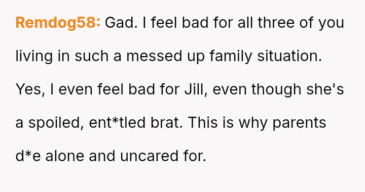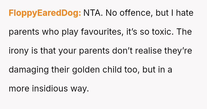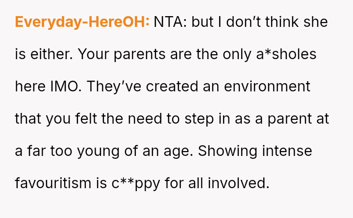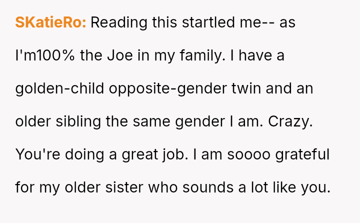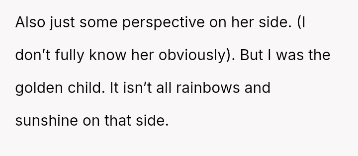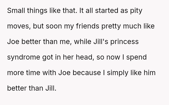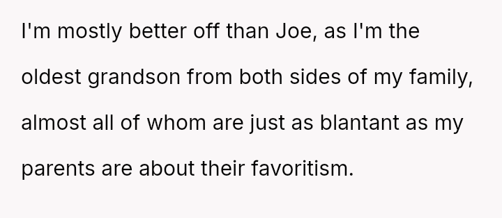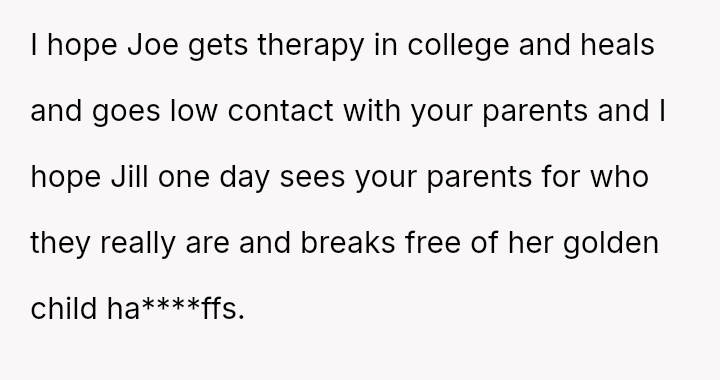 The original poster (OP) is experiencing a conflict rooted in years of parental favoritism, which has led to a close bond with one sibling (Joe) and a strained relationship with the other (Jill).