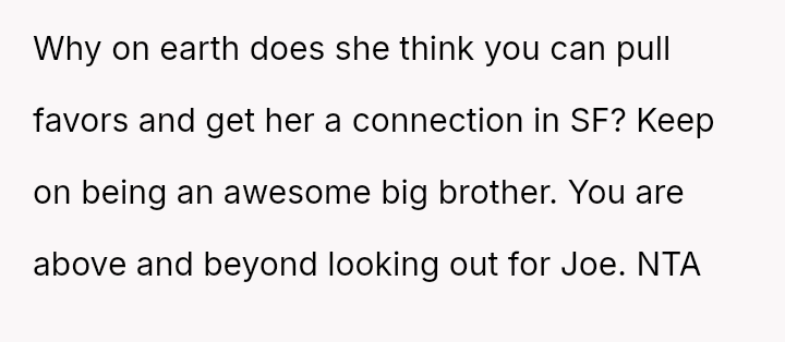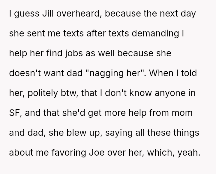 While the OP actively supported Joe against the family dynamic, their admission of preferring Joe's company over Jill's, and their subsequent refusal to help Jill find external employment, has directly ignited a major confrontation with their sister.
