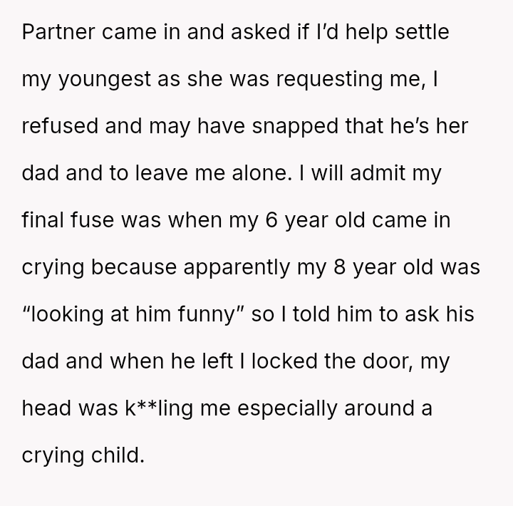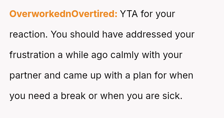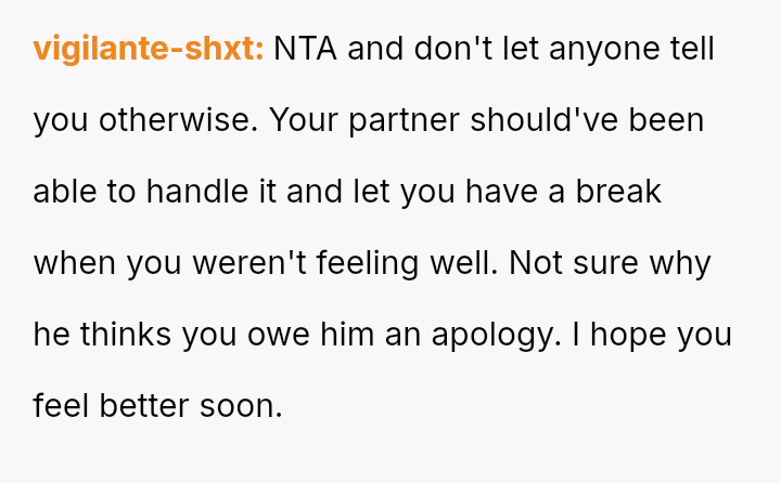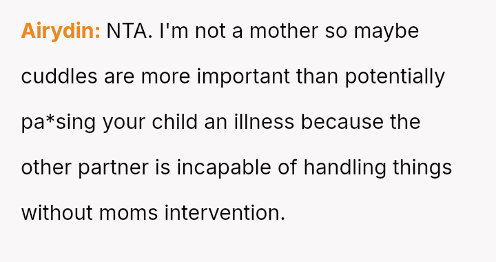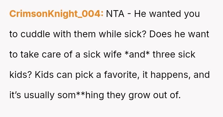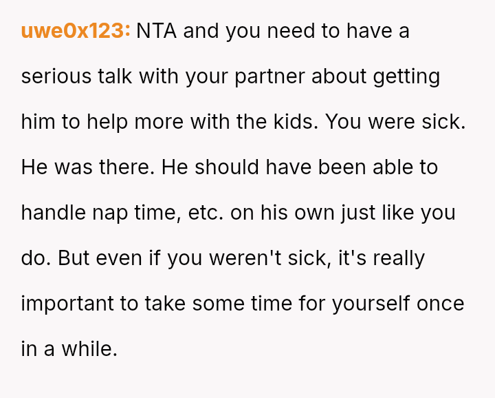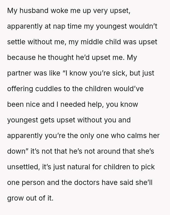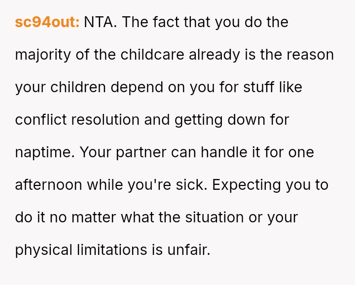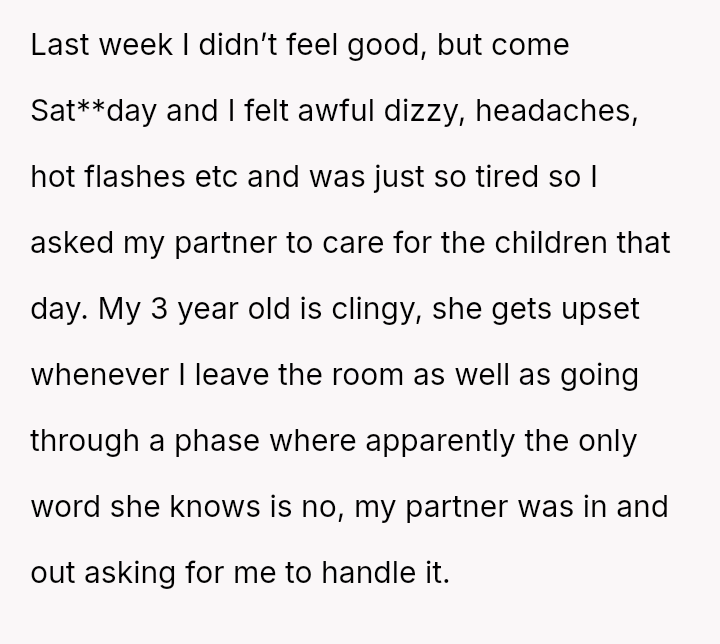 Given the es**blished division of labor and the OP's genuine sickness, was it reasonable for the partner to insist she manage the emotional needs of the children, or did the OP have a right to complete physical withdrawal from care duties for one day?