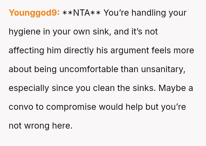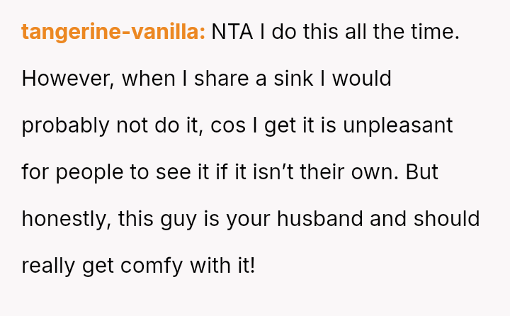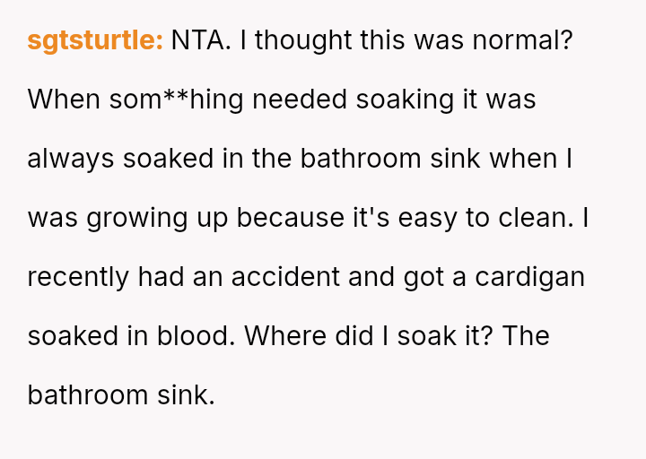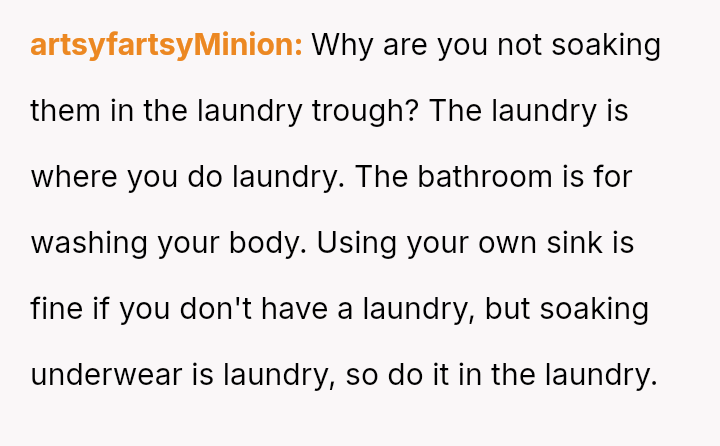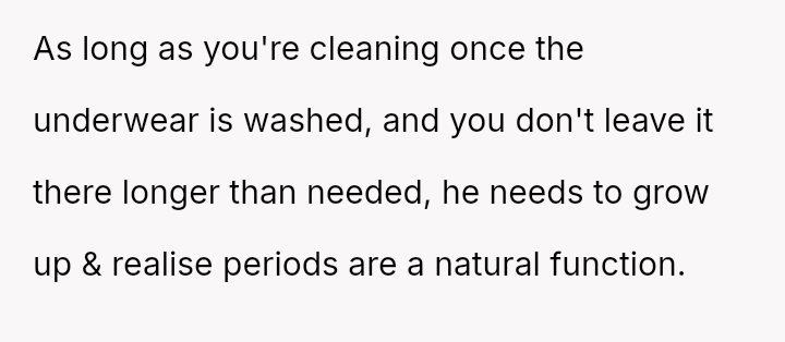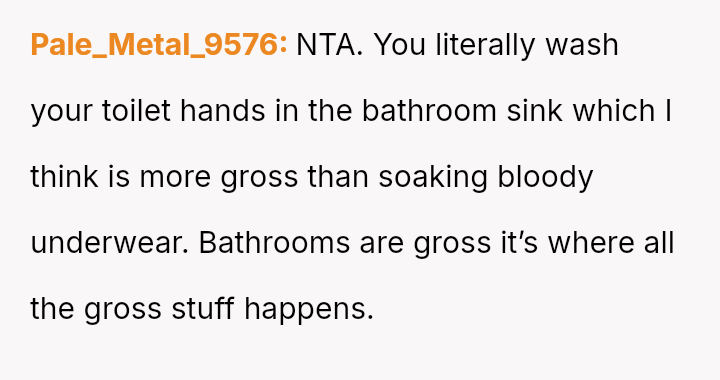 The Original Poster (OP) feels their m**hod of soaking used period underwear in their dedicated sink is practical and not inherently unsanitary, especially since they clean the bathroom, while the husband views the presence of blood-soaked items in the sink as unacceptable and unsanitary.