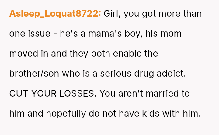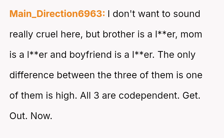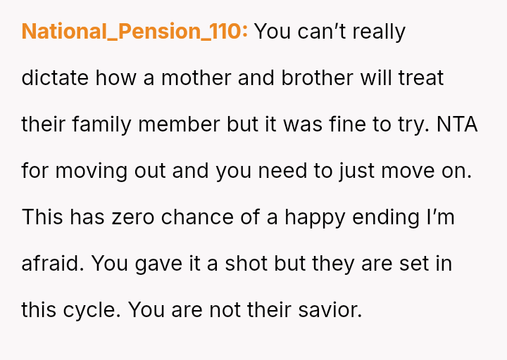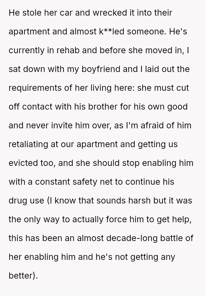 The original poster (OP) es**blished clear, necessary boundaries regarding the boyfriend's mother's cohabitation, primarily focused on cu***ng off enabling behavior toward the destructive brother.