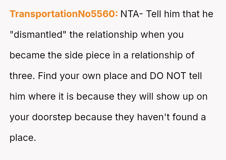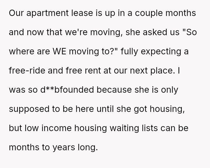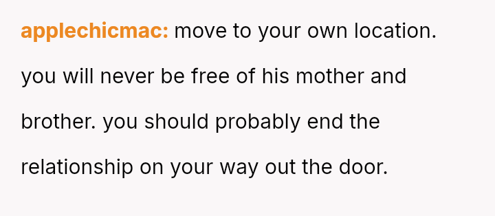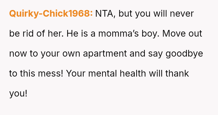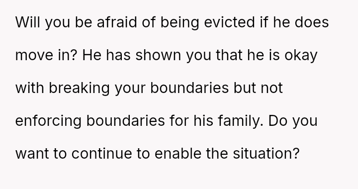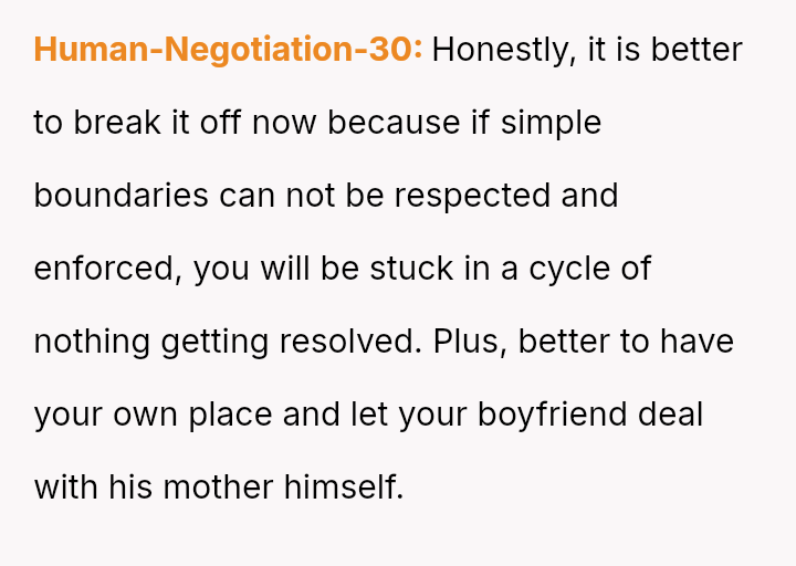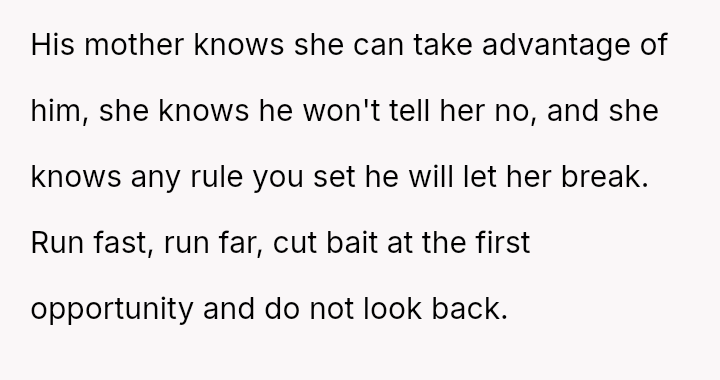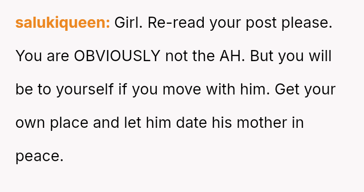 Given the boyfriend's inability to enforce boundaries due to guilt and the mother's immediate expectation of continued free housing, the core question remains: Can a relationship survive when one partner consistently prioritizes another person's comfort (the mother) over mutually agreed-upon commitments, and is the OP justified in seeking separate housing to preserve their own well-being and financial s**bility?