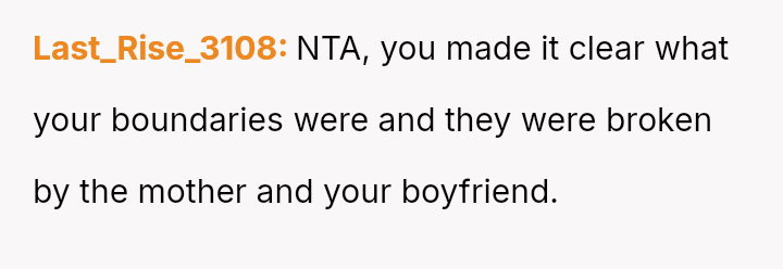 The central conflict arose when both the mother and the boyfriend v***ated these agreed-upon terms, leading the OP to feel betrayed and questioning the enforceability of any future joint decisions.