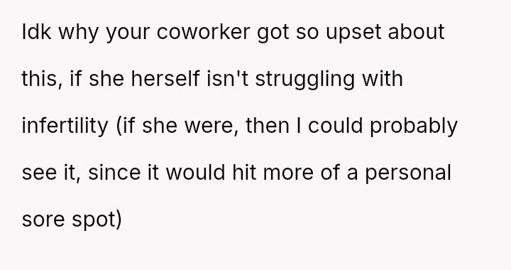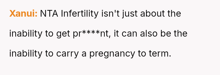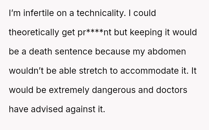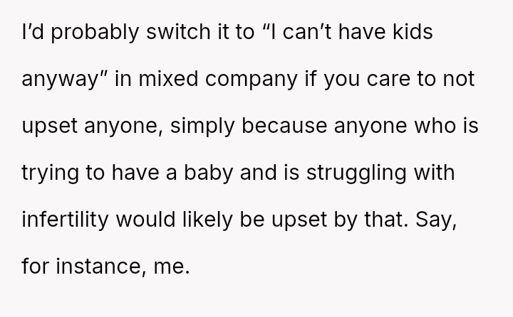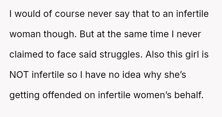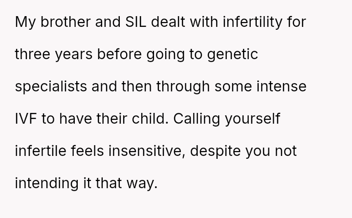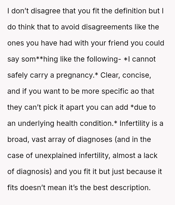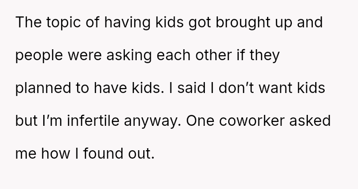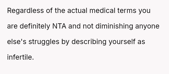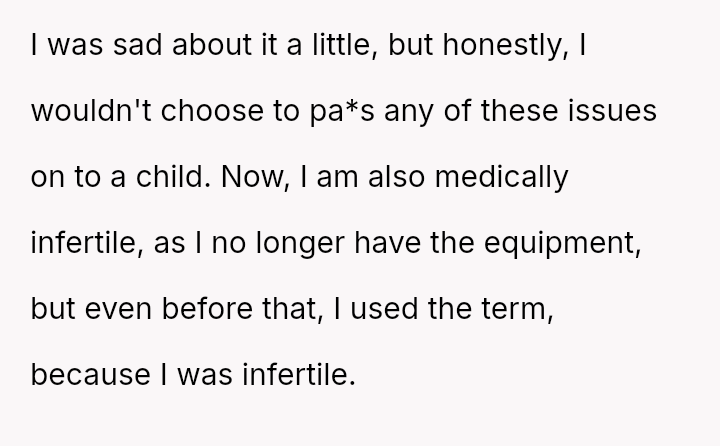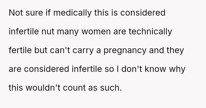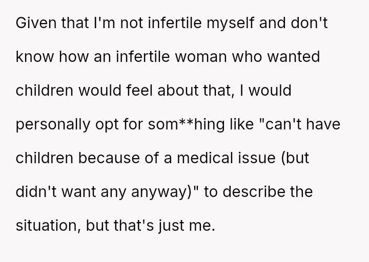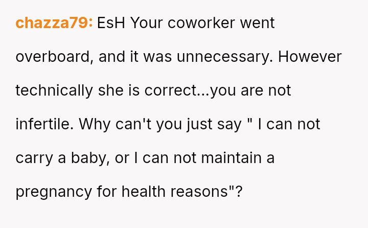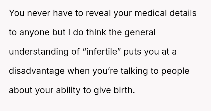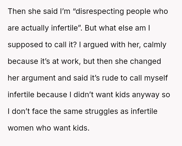 The original poster (OP) is facing conflict after describing their physical inability to safely carry a pregnancy due to a severe birth defect, using the term 'infertile.' The central conflict arises because a coworker disputes the OP's self-identification based on a narrow definition of infertility and the OP's lack of desire for children, leading to accusations of disrespecting others who face infertility struggles.