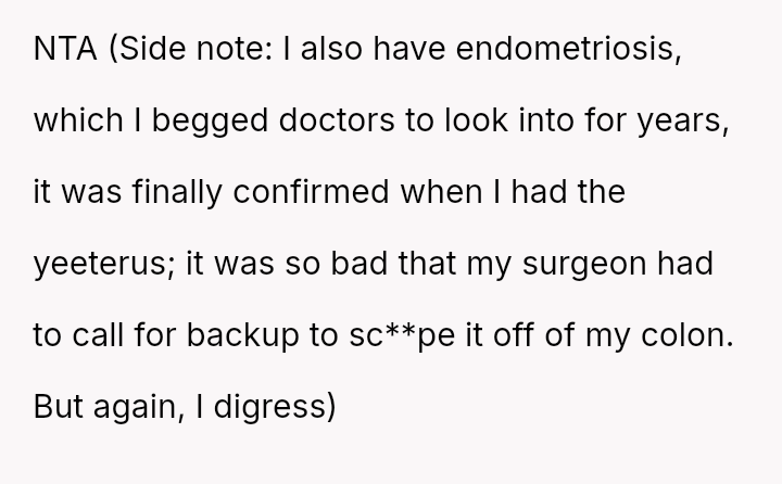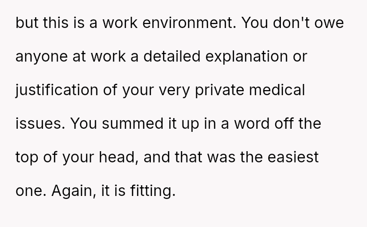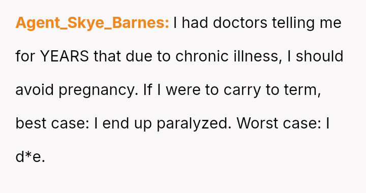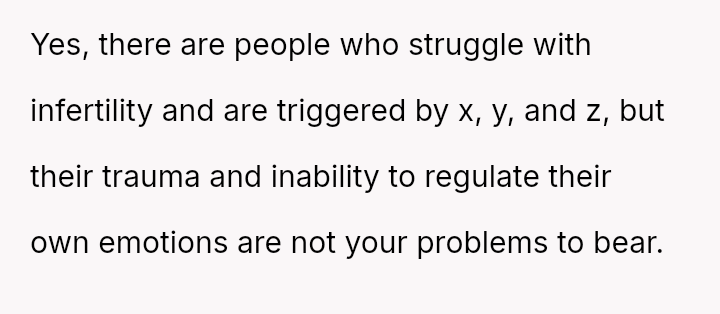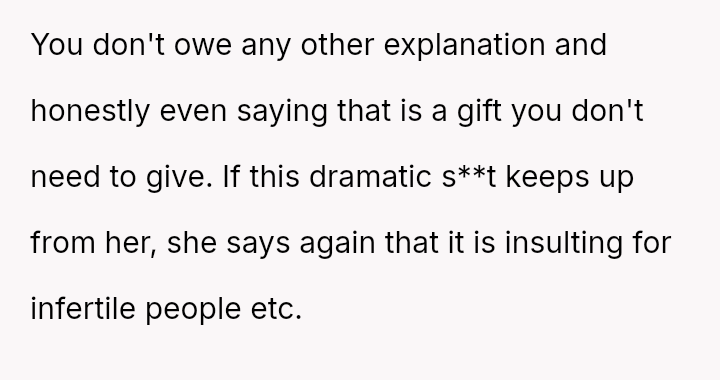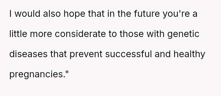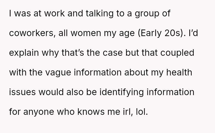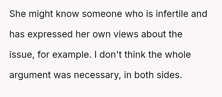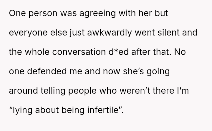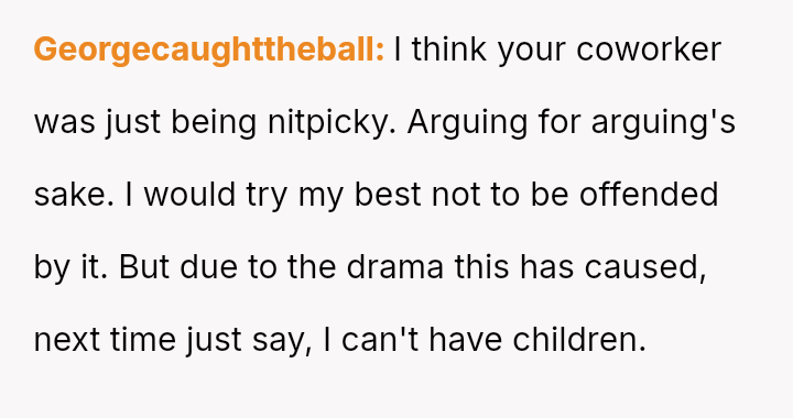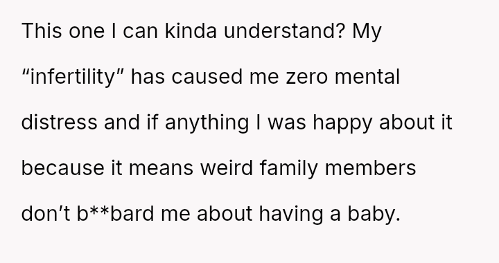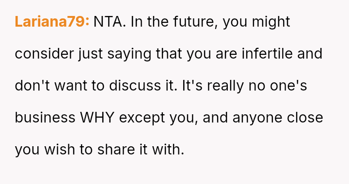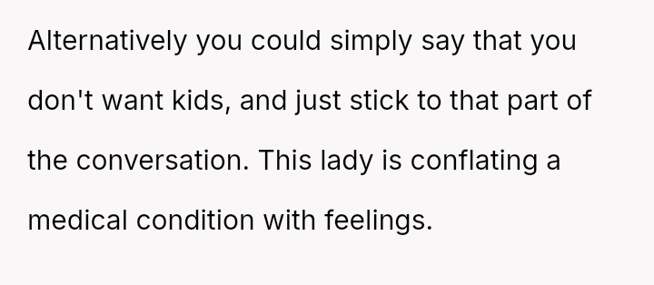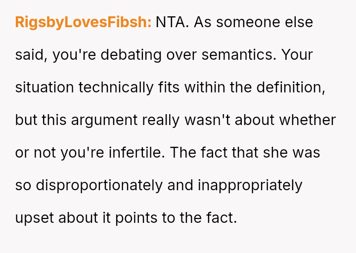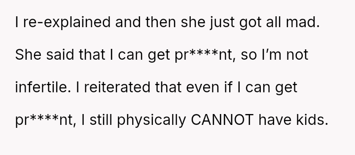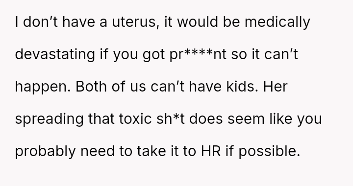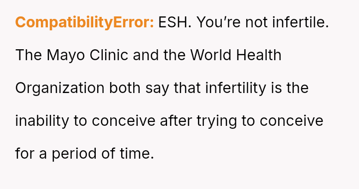The original poster (OP) is facing conflict after describing their physical inability to safely carry a pregnancy due to a severe birth defect, using the term 'infertile.' The central conflict arises because a coworker disputes the OP's self-identification based on a narrow definition of infertility and the OP's lack of desire for children, leading to accusations of disrespecting others who face infertility struggles.